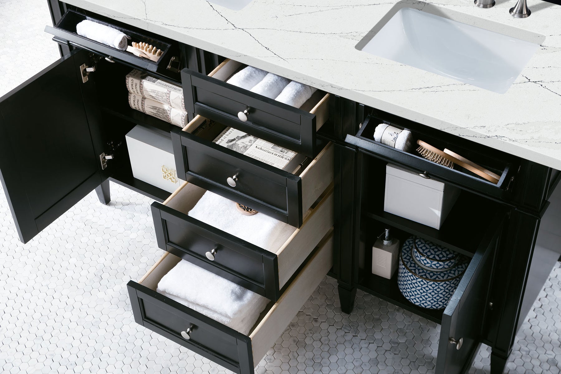 The Brittany 60" Double Vanity by James Martin Vanities features a rich Black Onyx finish and classic details that bridge both traditional and transitional styles. Featuring tapered legs and shaker-style detailing, this vanity includes two cabinet doors that open to reveal interior shelving. Four standard full-extension drawers and two top-row tip-out drawers lend additional storage. Brittany showcases Satin Nickel hardware and comes with an optional coordinating wood backsplash. A striking Eternal Noctis Silestone® top with undermount sinks completes the look.