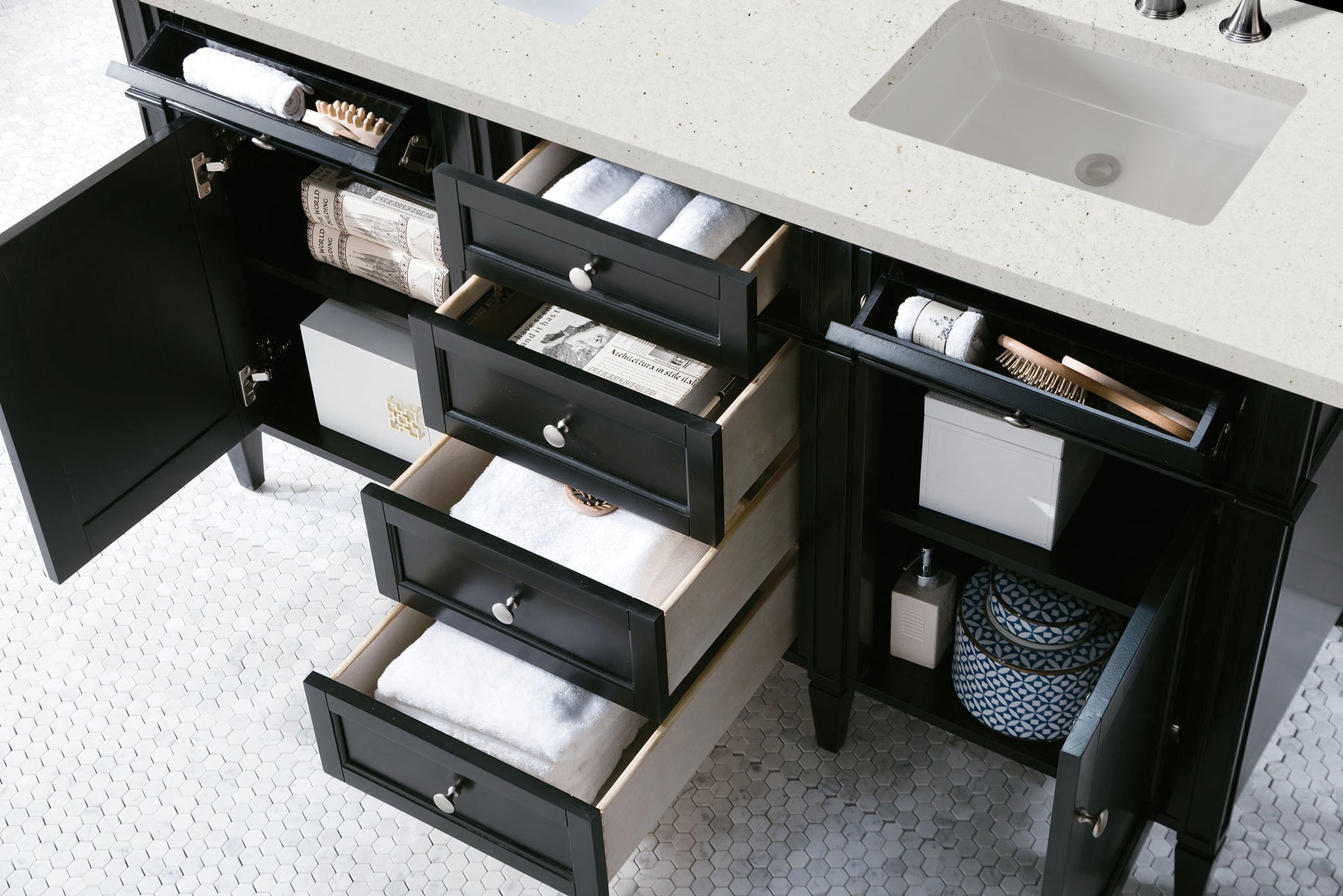 The Brittany 60" Black Onyx Single Vanity by James Martin Vanities features classic details that bridge both traditional and transitional styles. This beautiful piece of furniture includes one hide-away top row tip-out drawer, plus six full-depth drawers, two of which are double-height for storage of taller items. This cabinet also has one door, which conceals an interior shelf for ample storage. Handcrafted in yellow Poplar solids and veneers with satin nickel hardware. Matching wood backsplash is included. The look is completed with a 3 CM eased-edge countertop by Cosentino in Lime Delight, which brings a warm, textured beige tones in a suede finish. It includes pre-drilled holes for two 8-inch widespread faucets (not included), two white porcelain rectangular sinks, as well as the appropriate mounting brackets for installation.