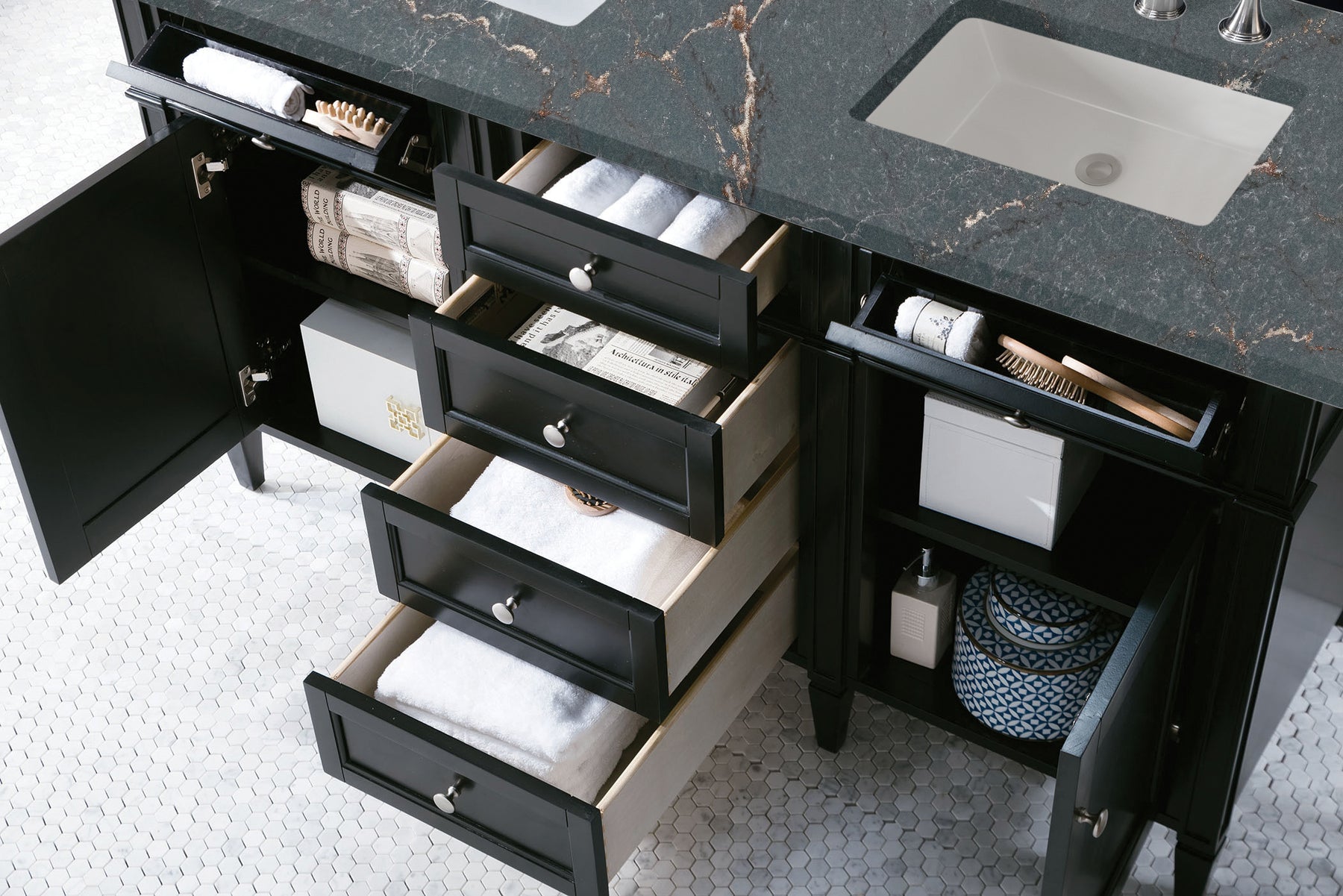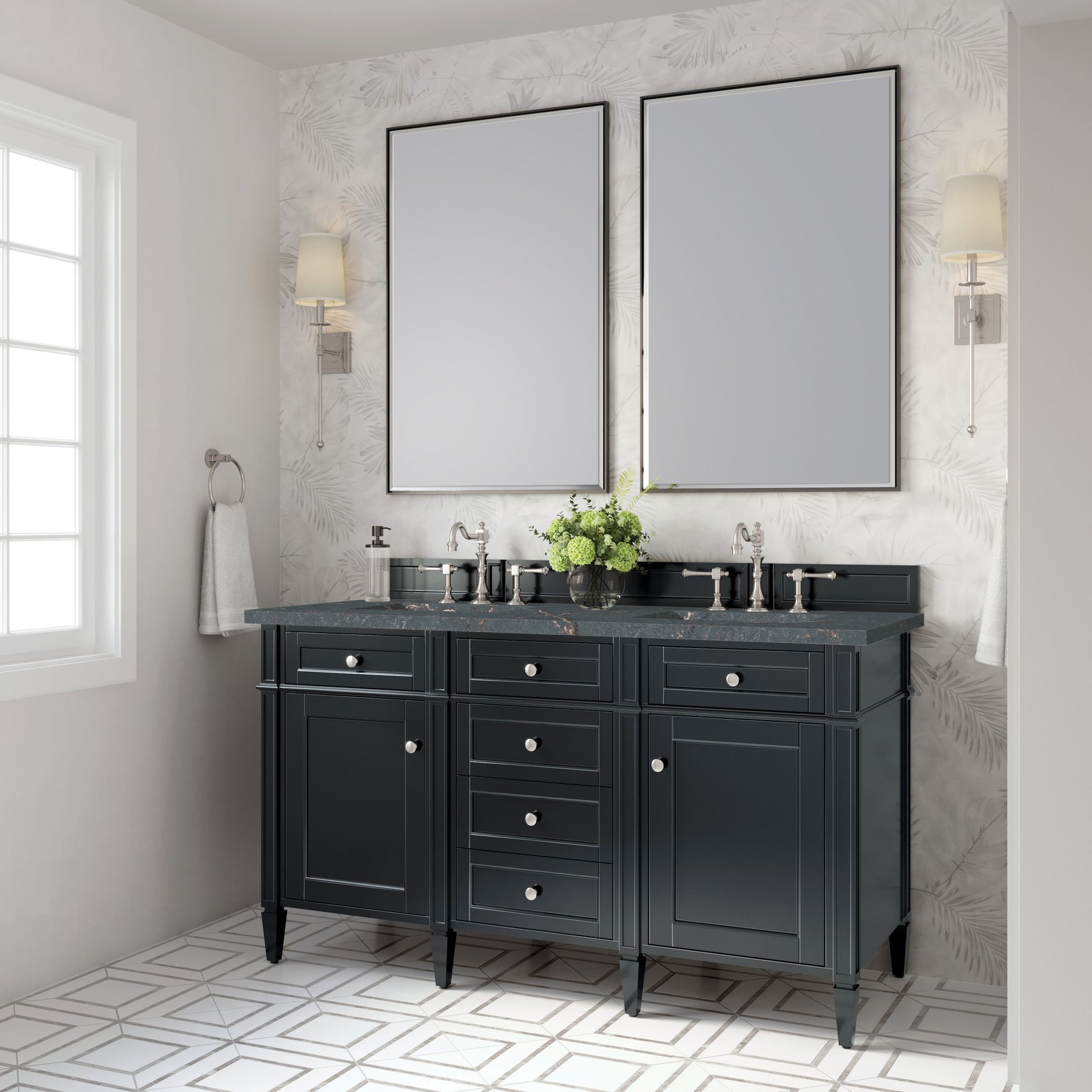 The Brittany 60" Double Vanity by James Martin Vanities features a rich Black Onyx finish and classic details that bridge both traditional and transitional styles. Featuring tapered legs and shaker-style detailing, this vanity includes two cabinet doors that open to reveal interior shelving. Four standard full-extension drawers and two top-row tip-out drawers lend additional storage. Brittany showcases Satin Nickel hardware and comes with an optional coordinating wood backsplash. A gorgeous Parisien Bleu Silestone® top with undermount sinks completes the look.