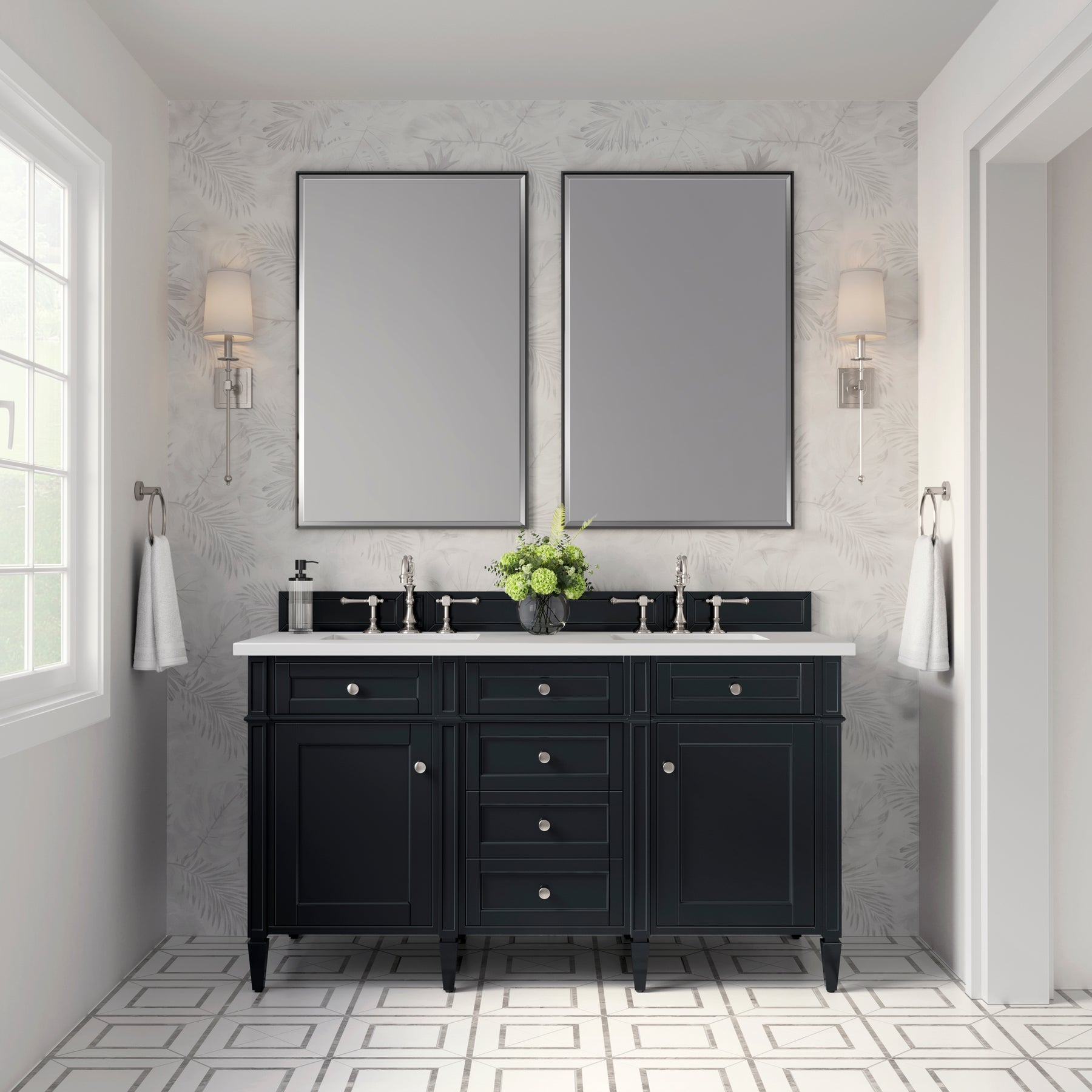 The Brittany 60" Black Onyx Double Vanity by James Martin Vanities features classic details that bridge both traditional and transitional styles. This beautiful piece of furniture includes two hide-away tip-out, top row drawers and four full-depth drawers. This cabinet also has two doors, which conceal an interior shelf for ample storage. Handcrafted in yellow poplar solids and veneers with satin nickel hardware. Matching wood backsplash is included. The look is completed with a 3 CM eased edge 3 CM eased edge White Zeus Silestone top with two white ceramic rectangular sinks.