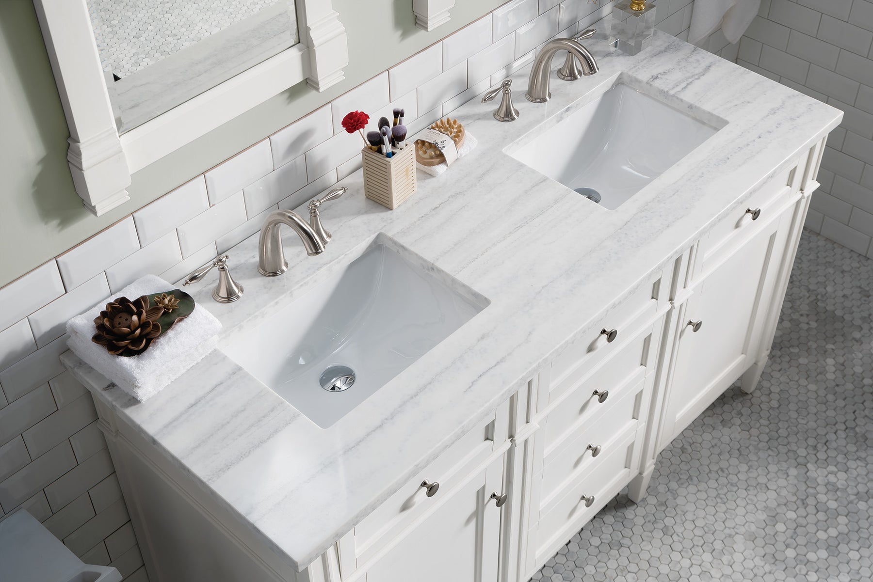 The Brittany 60" Bright White Double Vanity by James Martin Vanities features classic details that bridge both traditional and transitional styles. This beautiful piece of furniture includes two hide-away tip-out, top row drawers plus four full-depth drawers. This cabinet also has two doors, which conceal an interior shelf, for ample storage. Hand crafted in yellow poplar solids and yellow poplar veneers with Satin Nickel hardware. Matching wood backsplash is included. Completing this beautiful vanity is a 3 cm solid surface Arctic Fall vanity top, which displays horizontal grey veining, giving you the look of classic marble with the benefits of modern technology.