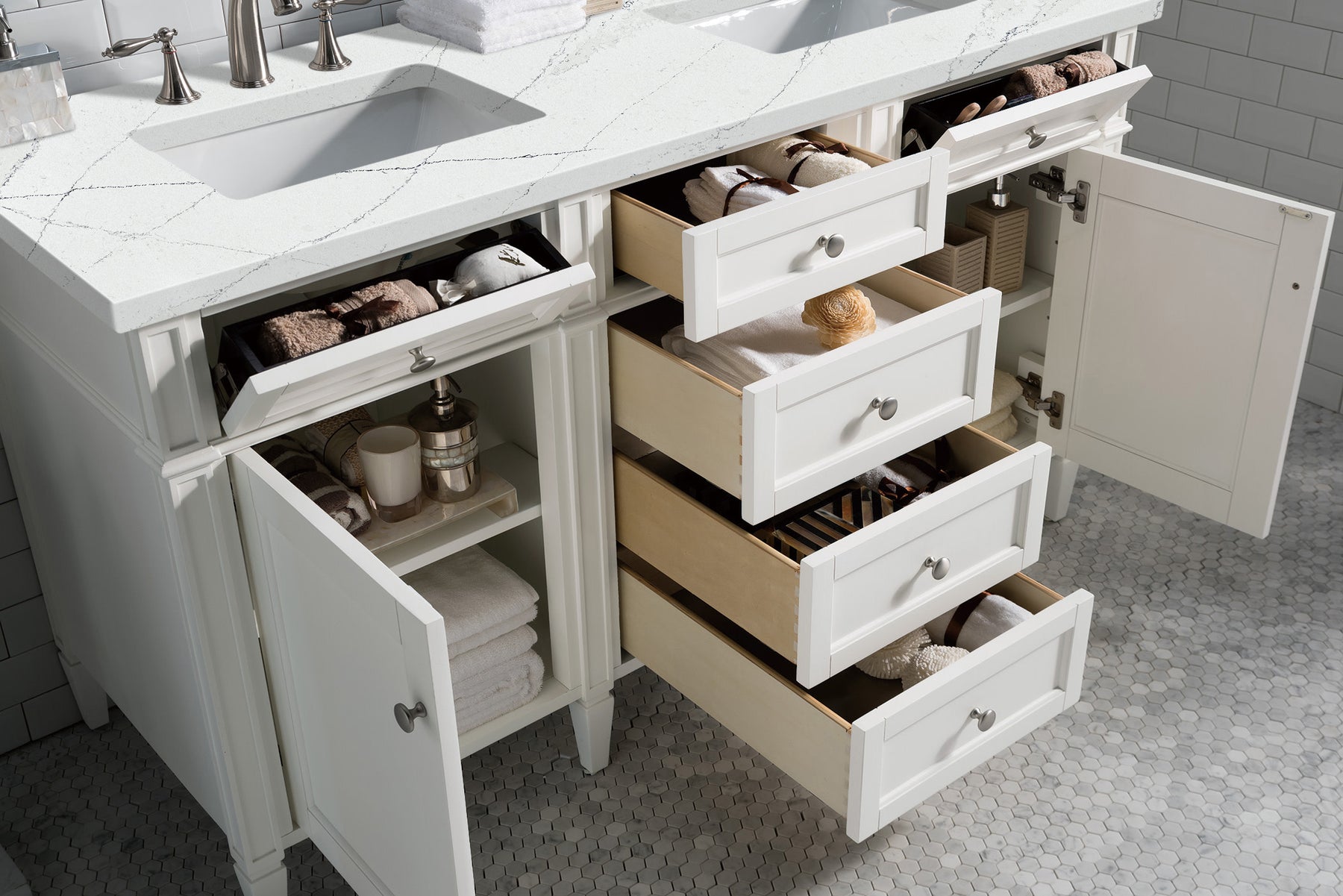 The Brittany 60" Bright White Double Vanity by James Martin Vanities features classic details that bridge both traditional and transitional styles. This beautiful piece of furniture includes two hide-away tip-out, top row drawers plus four full-depth drawers. This cabinet also has two doors, which conceal an interior shelf, for ample storage. Hand crafted in yellow poplar solids and yellow poplar veneers with Satin Nickel hardware. Matching wood backsplash is included. Completing the look is an Ethereal Noctis Silestone top by Cosentino, featuring modern, intricate black and gray nuances to add contrast and elegance to the white background.