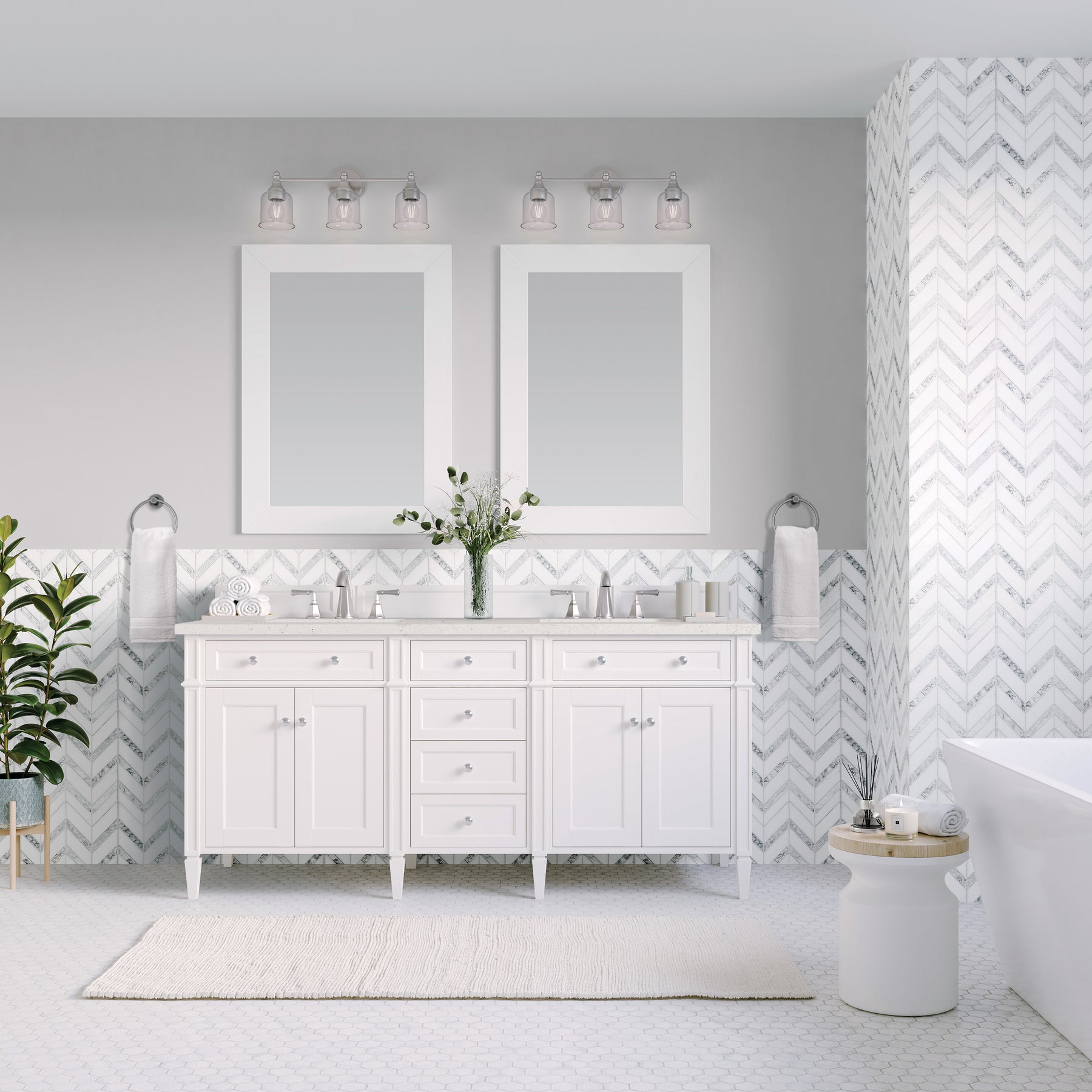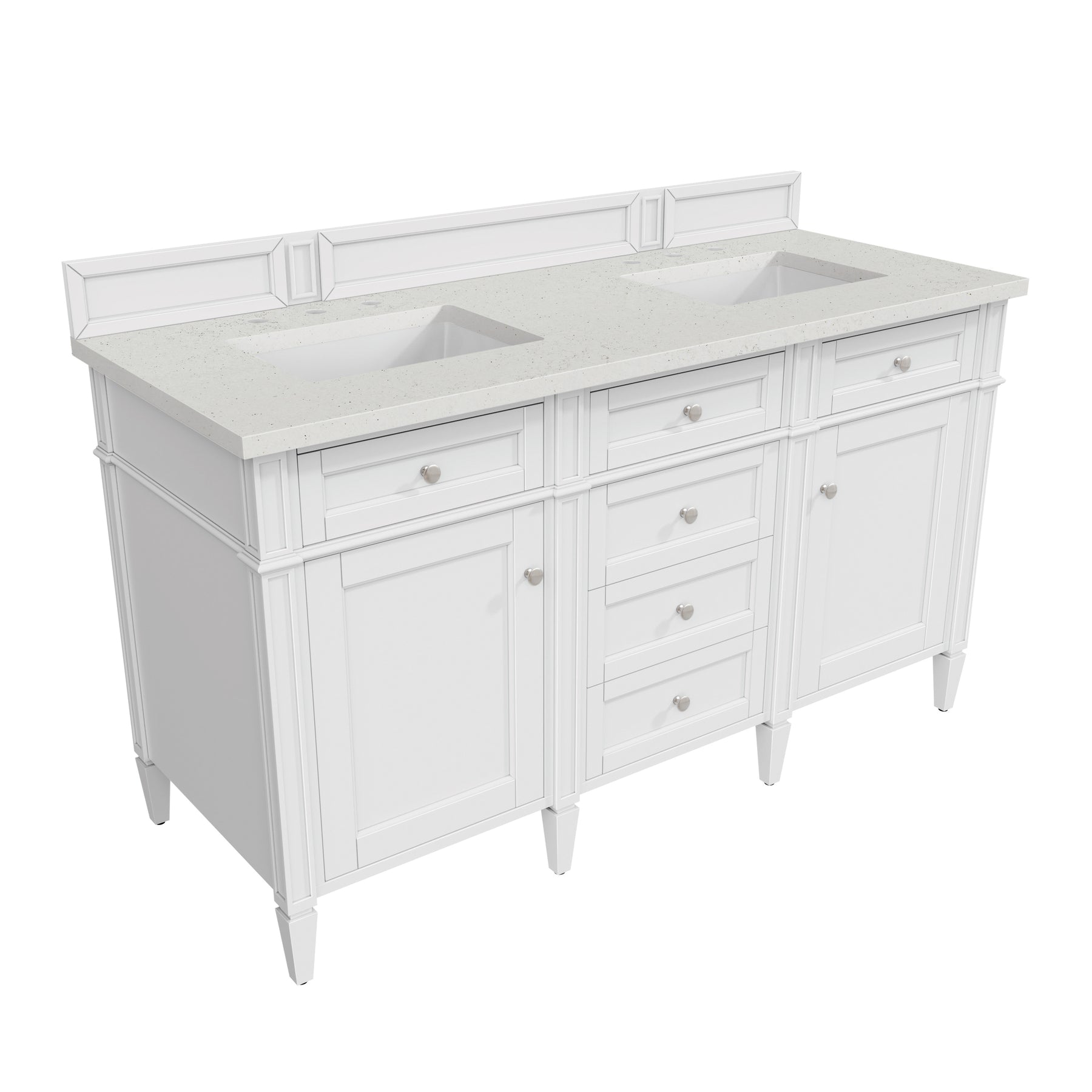 The Brittany 60" Bright White Double Vanity by James Martin Vanities features classic details that bridge both traditional and transitional styles. This beautiful piece of furniture includes two hide-away tip-out, top row drawers plus four full-depth drawers. This cabinet also has two doors, which conceal an interior shelf, for ample storage. Hand crafted in yellow Poplar solids and yellow Poplar veneers with Satin Nickel hardware. Matching wood backsplash is included. The Lime Delight Silestone top lends warm, textured beige tones to perfectly complement the finish on the vanity.