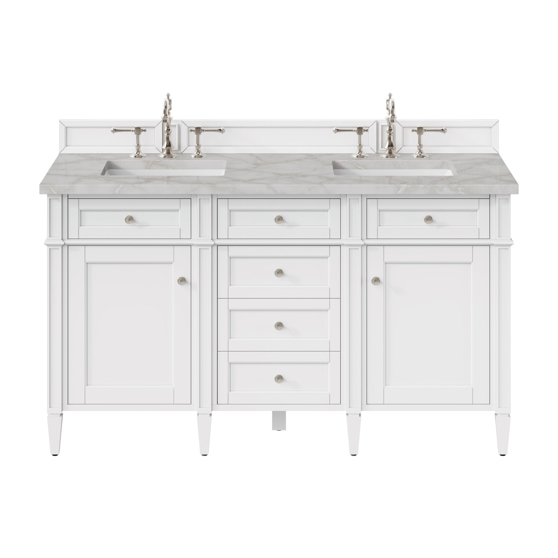 The Brittany 60" Bright White Double Vanity by James Martin Vanities features classic details that bridge both traditional and transitional styles. This beautiful piece of furniture includes two hide-away tip-out, top row drawers plus four full-depth drawers. This cabinet also has two doors, which conceal an interior shelf, for ample storage. Hand crafted in yellow Poplar solids and yellow Poplar veneers with Satin Nickel hardware. Matching wood backsplash is included. With the addition of an elegant Victorian Silver Silestone top and undermount sink, this vanity is an seamless integration of modern design and functionality.