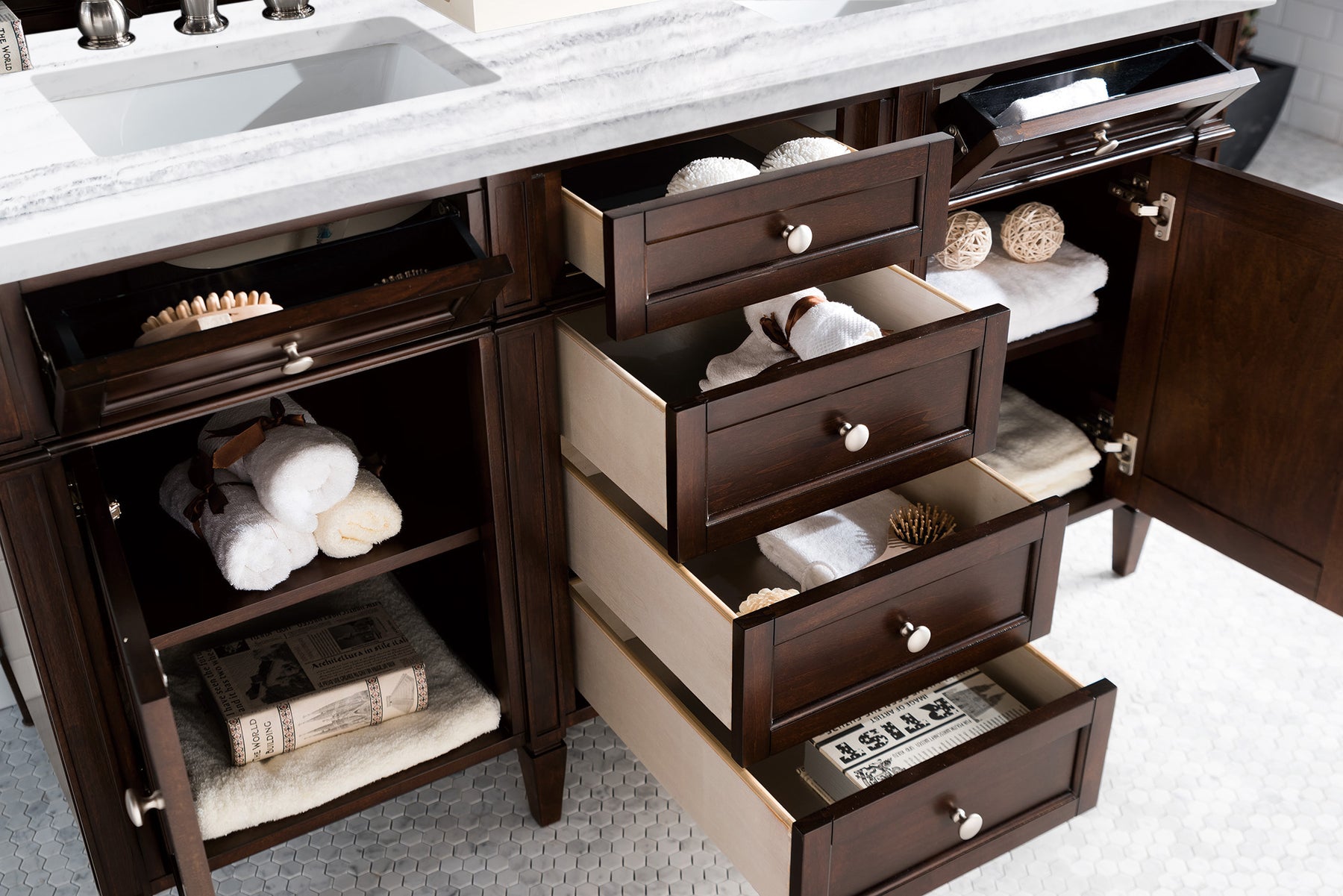 The Brittany 60" Burnished Mahogany Double Vanity by James Martin Vanities features classic details that bridge both traditional and transitional styles. This beautiful piece of furniture includes two hide-away tip-out, top row drawers and four full-depth drawers. This cabinet also has two doors, which conceal an interior shelf for ample storage. Handcrafted in yellow poplar solids and veneers with satin nickel hardware. Matching wood backsplash is included. The look is completed with a 3 CM eased edge 3 CM eased edge Arctic Fall Solid Surface top with two white ceramic rectangular sinks.