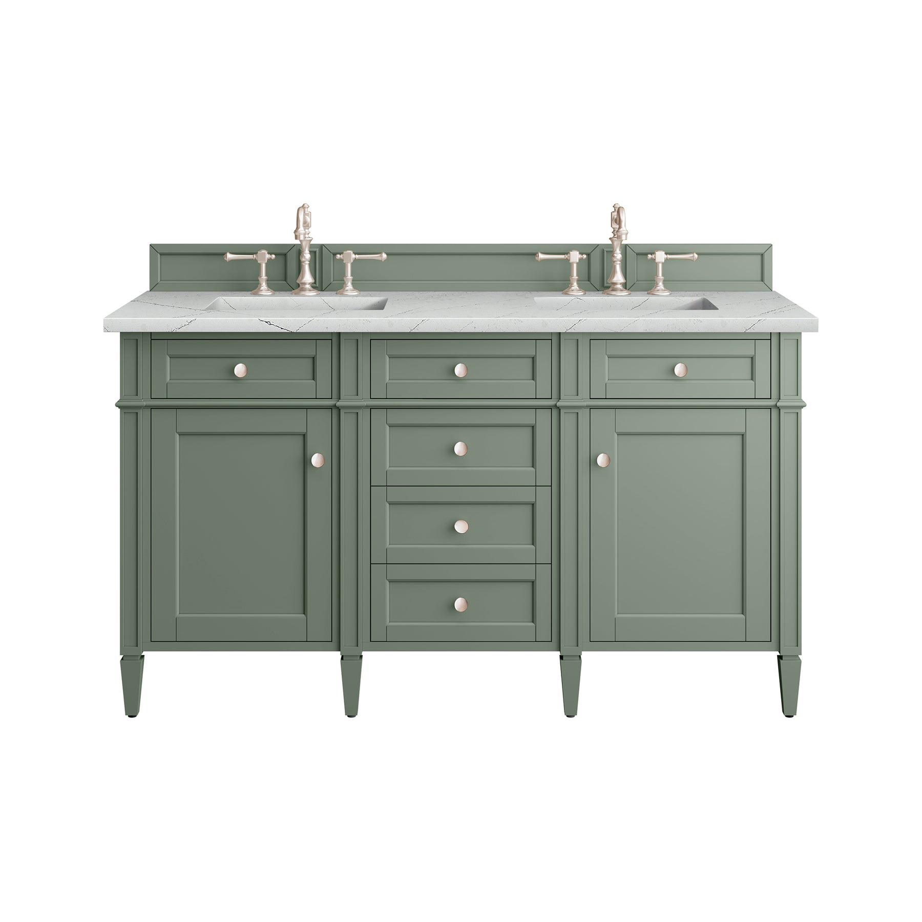 The Brittany 60" Double Vanity by James Martin Vanities features a Smokey Celadon finish and classic details that bridge both traditional and transitional styles. Featuring tapered legs and shaker-style detailing, this vanity includes two cabinet doors that open to reveal interior shelving. Four standard full-extension drawers and two top-row tip-out drawers lend additional storage. Brittany showcases Satin Nickel hardware and comes with an optional coordinating wood backsplash. A striking Eternal Noctis Silestone® top with undermount sinks completes the look.