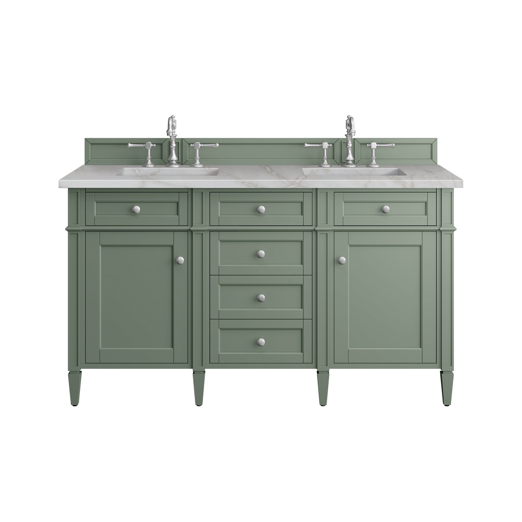 The Brittany 60" Double Vanity by James Martin Vanities features a Smokey Celadon finish and classic details that bridge both traditional and transitional styles. Featuring tapered legs and shaker-style detailing, this vanity includes two cabinet doors that open to reveal interior shelving. Four standard full-extension drawers and two top-row tip-out drawers lend additional storage. Brittany showcases Satin Nickel hardware and comes with an optional coordinating wood backsplash. A stunning Victorian Silver Silestone® top with undermount sinks completes the look.