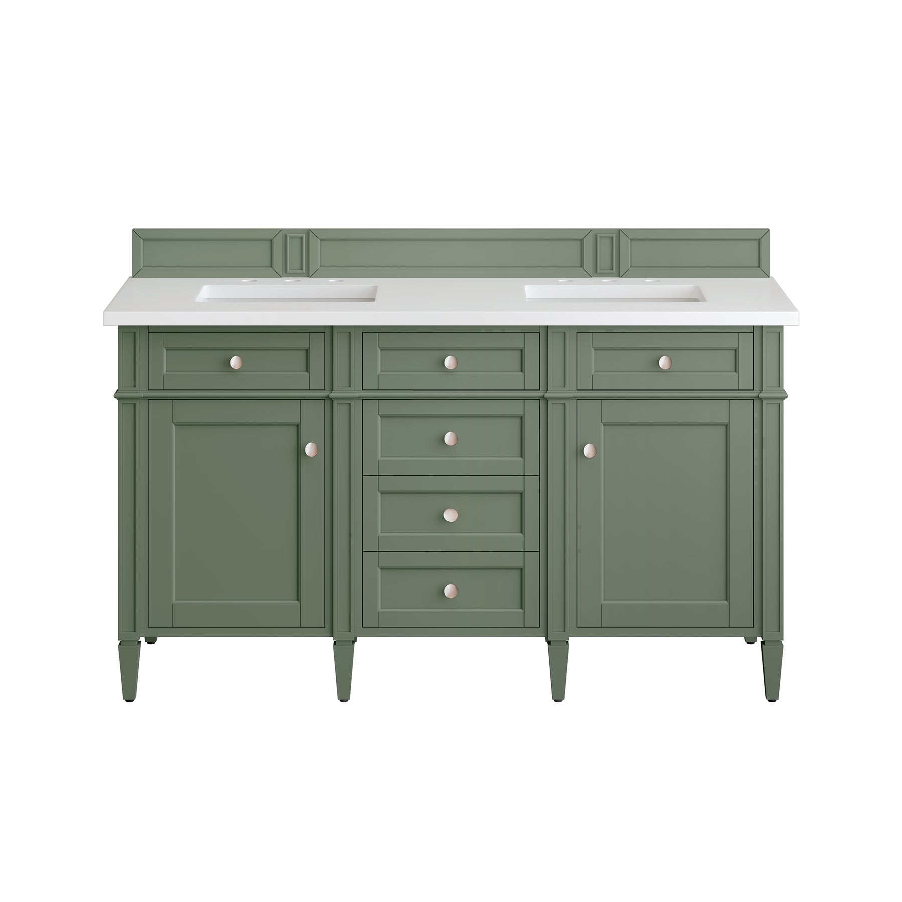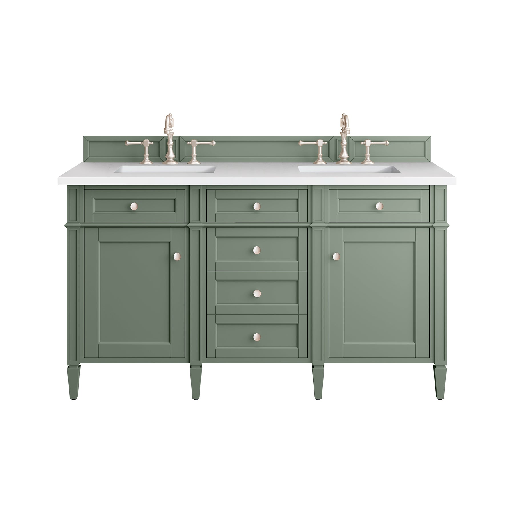 The Smokey Celadon finish on the 60" Brittany Double Vanity Brittany Vanity adds a refreshing, natural element to any bathroom space. This moody, yet muted green, with subtle blue and grey undertones, brings the rich, timeless details of the Brittany collection to life. The 60" Brittany Double Vanity Cabinet, with decorative wood backsplash, features optimal organization with two hide-away tip-out drawers plus four center drawers. This cabinet also has two doors, each concealing an interior shelf. All drawers are lined with an aluminum laminate surface for easy cleaning and are equipped with undermount soft-close slides. The bright, crisp White Zeus 3 CM Silestone top adds a beautiful finishing touch. All of our 3 CM tops include a porcelain undermount sink.