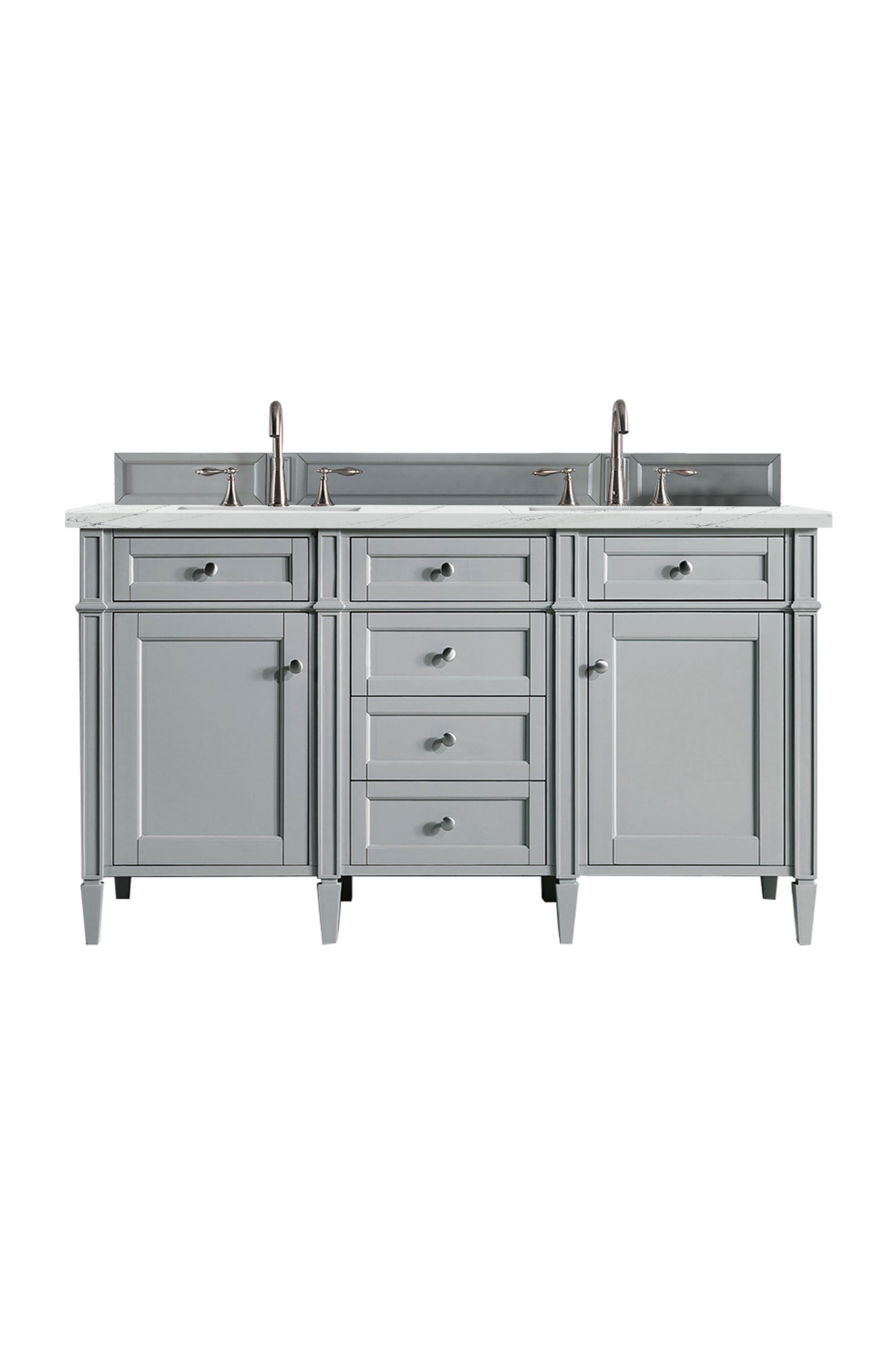 The Brittany 60" Double Vanity by James Martin Vanities features an Urban Gray finish and classic details that bridge both traditional and transitional styles. Featuring tapered legs and shaker-style detailing, this vanity includes two cabinet doors that open to reveal interior shelving. Four standard full-extension drawers and two top-row tip-out drawers lend additional storage. Brittany showcases Satin Nickel hardware and comes with an optional coordinating wood backsplash. A striking Eternal Noctis Silestone® top with undermount sinks completes the look.