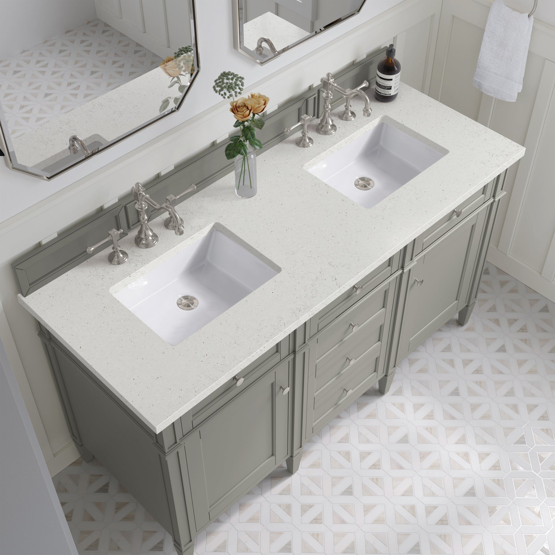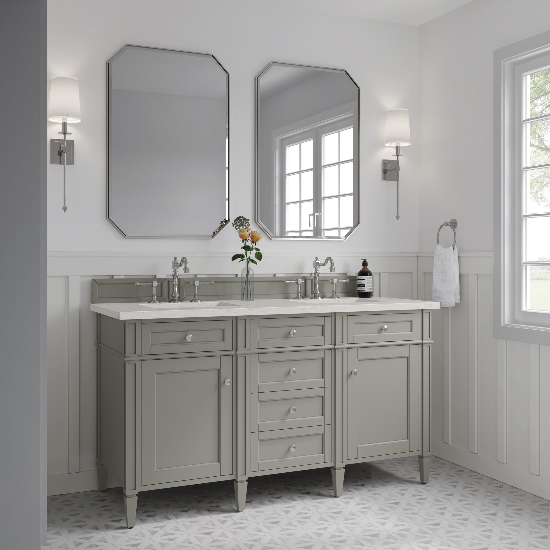 The Brittany 60" Urban Gray Double Vanity by James Martin Vanities features classic details that bridge both traditional and transitional styles. This beautiful piece of furniture includes two hide-away tip-out, top row drawers and four full-depth drawers. This cabinet also has two doors, which conceal an interior shelf for ample storage. Handcrafted in yellow Poplar solids and veneers with satin nickel hardware. Matching wood backsplash is included. The look is completed with a 3 CM eased-edge countertop by Cosentino in Lime Delight, which brings a warm, textured beige tones in a suede finish. It includes pre-drilled holes for two 8-inch widespread faucets (not included), two white porcelain rectangular sinks, as well as the appropriate mounting brackets for installation.