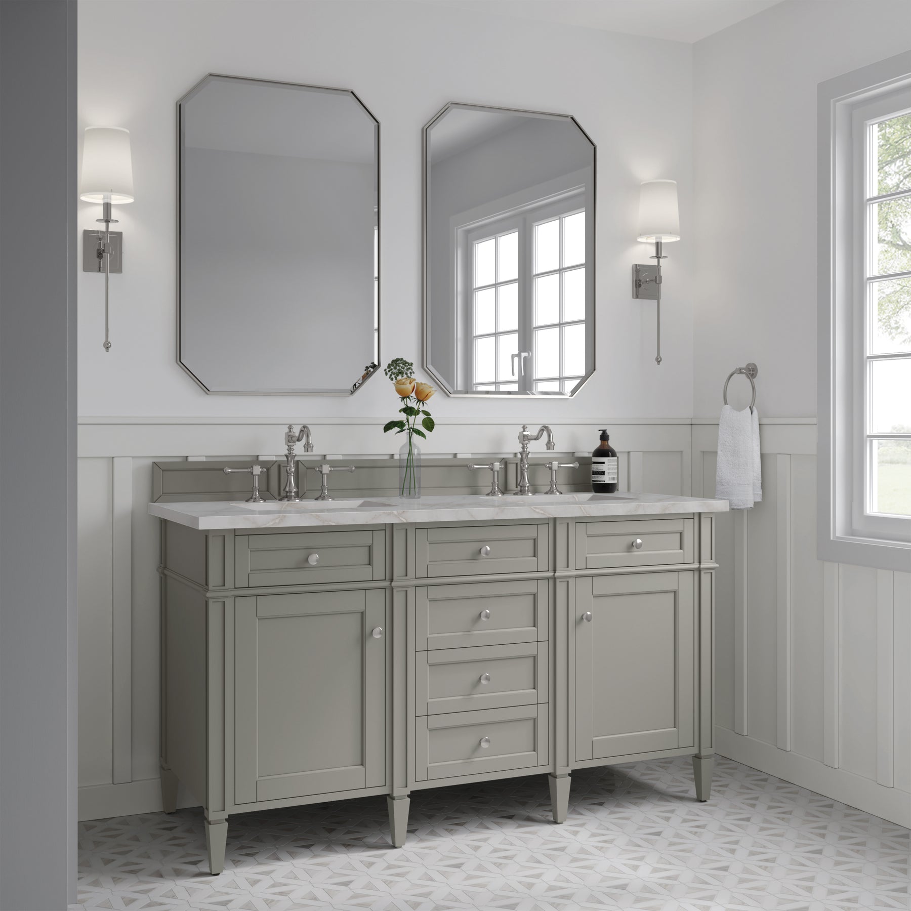 The Brittany 60" Urban Gray Double Vanity by James Martin Vanities features classic details that bridge both traditional and transitional styles. This beautiful piece of furniture includes two hide-away tip-out, top row drawers and four full-depth drawers. This cabinet also has two doors, which conceal an interior shelf for ample storage. Handcrafted in yellow Poplar solids and veneers with satin nickel hardware. Matching wood backsplash is included. The look is completed with a 3 CM eased-edge countertop by Cosentino in Victorian Silver, which features a cool background tone with silver and dark neutral veins, complimented with champagne metallic accents. It includes pre-drilled holes for two 8-inch widespread faucets (not included), two white porcelain rectangular sinks, as well as the appropriate mounting brackets for installation.