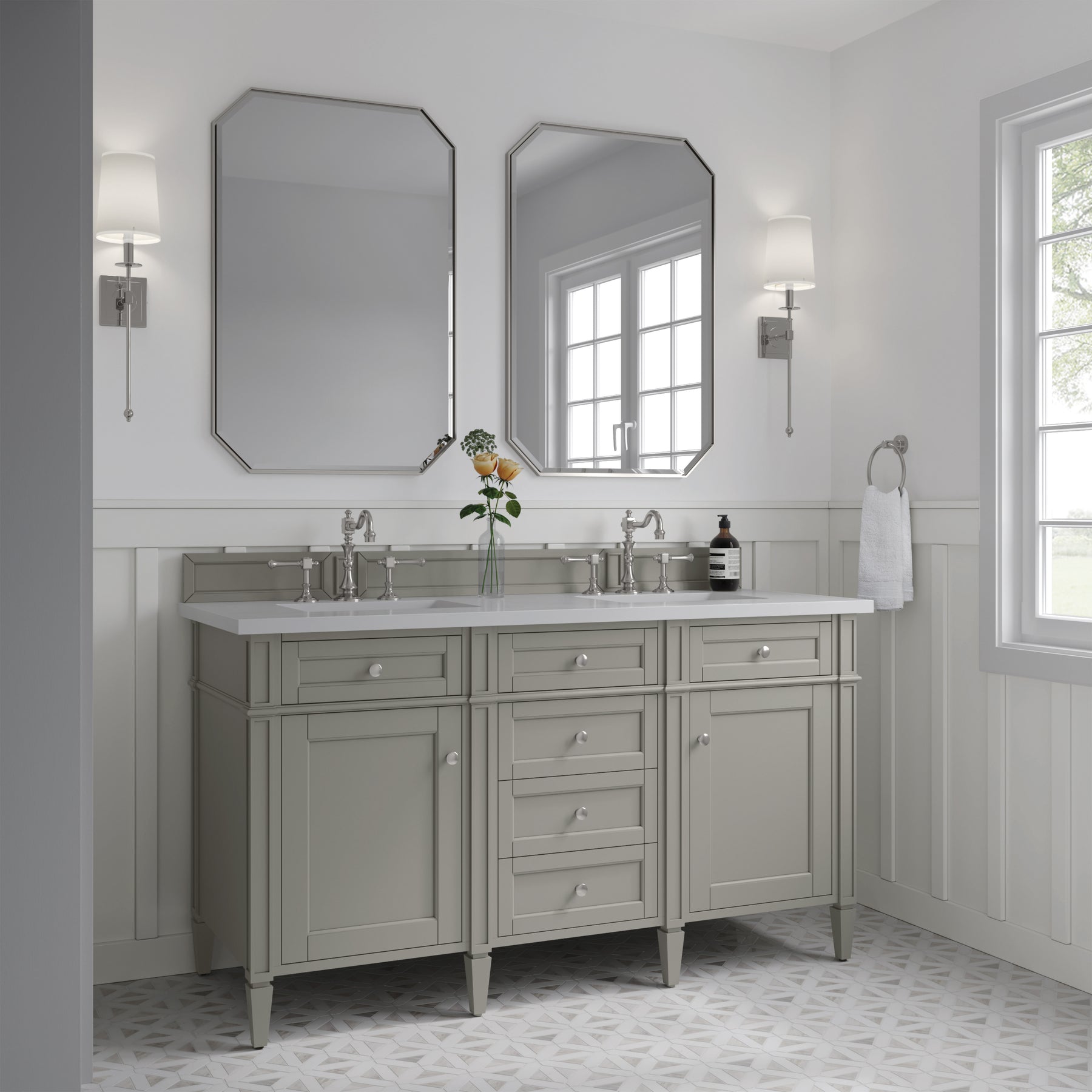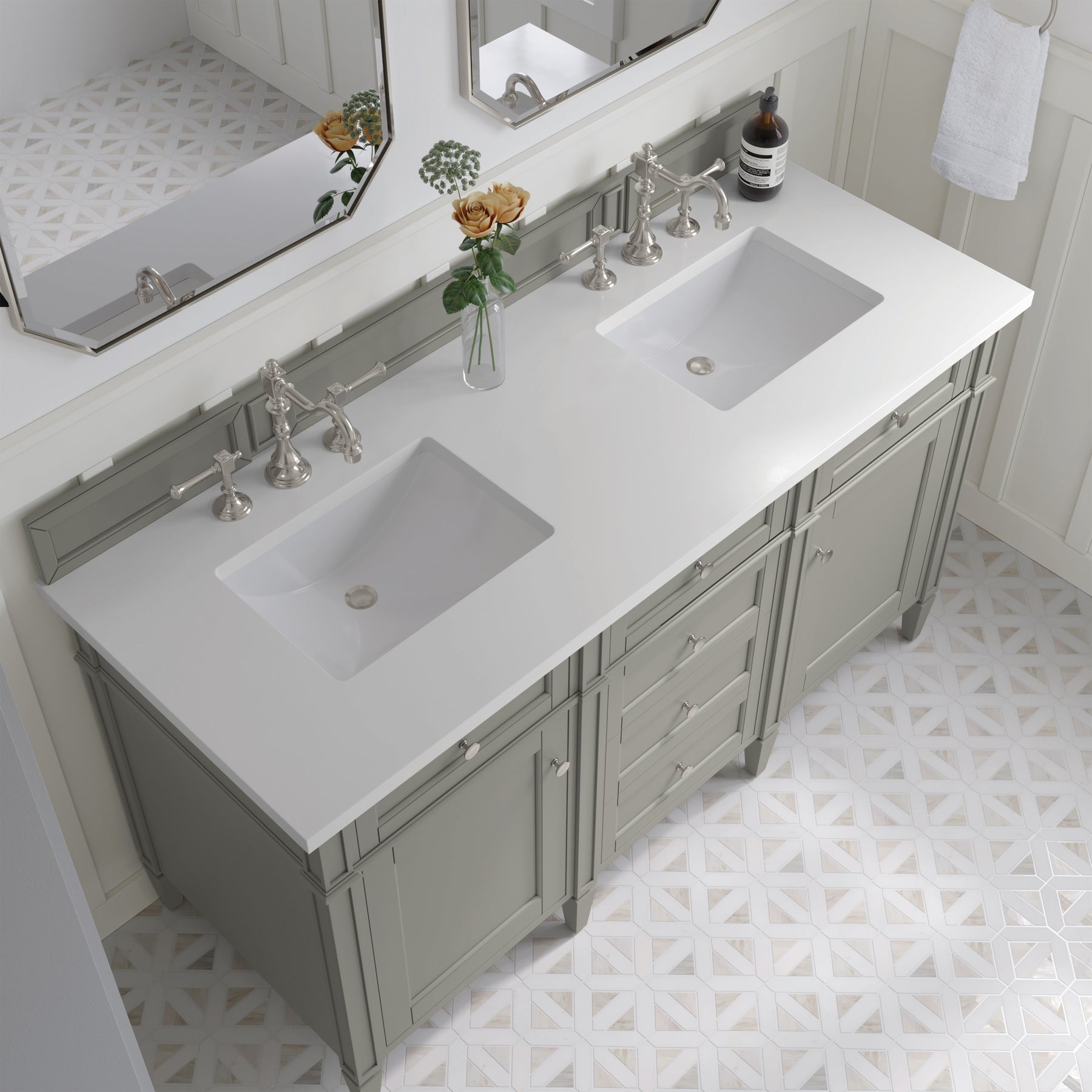 The Brittany 60" Urban Gray Double Vanity by James Martin Vanities features classic details that bridge both traditional and transitional styles. This beautiful piece of furniture includes two hide-away tip-out, top row drawers and four full-depth drawers. This cabinet also has two doors, which conceal an interior shelf for ample storage. Handcrafted in yellow poplar solids and veneers with satin nickel hardware. Matching wood backsplash is included. The look is completed with a 3 CM eased edge 3 CM eased edge White Zeus Silestone top with two white ceramic rectangular sinks.