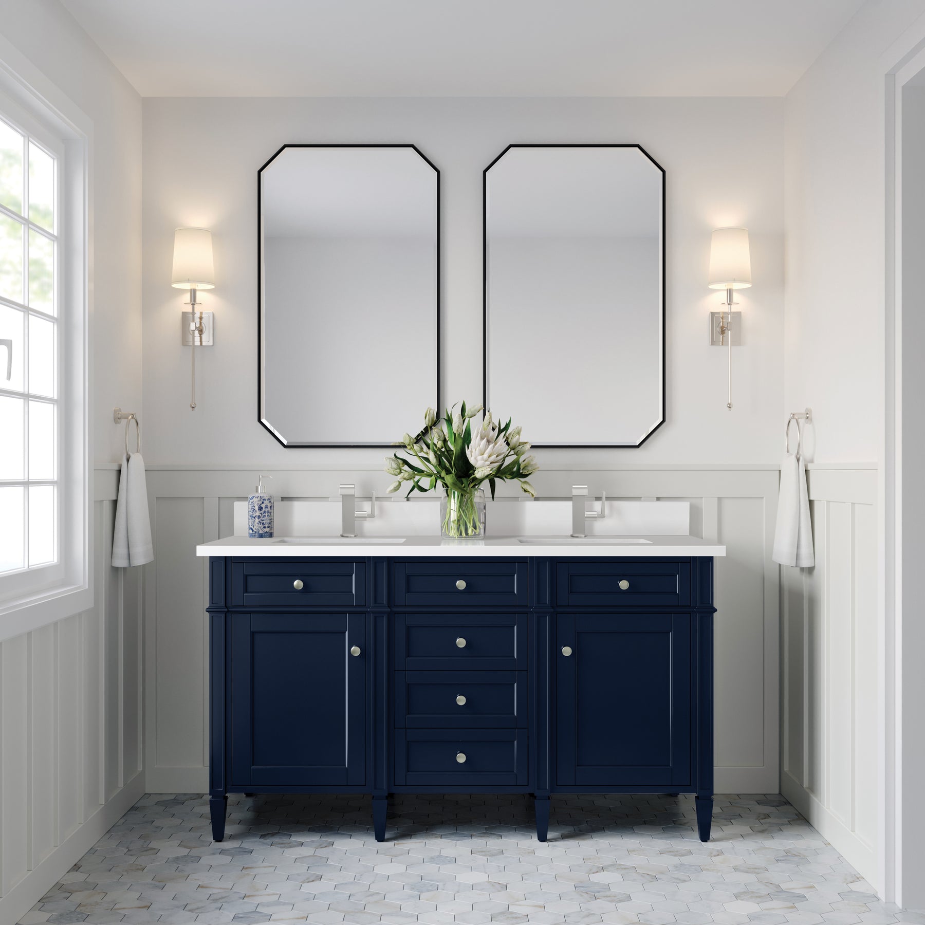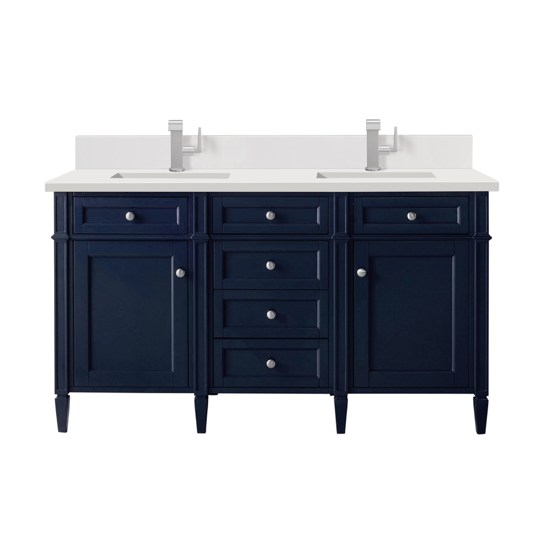 The Brittany 60" Victory Blue Double Vanity by James Martin Vanities features classic details that bridge both traditional and transitional styles. This beautiful piece of furniture includes two hide-away tip-out, top row drawers and four full-depth drawers. This cabinet also has two doors, which conceal an interior shelf for ample storage. Handcrafted in yellow Poplar solids and veneers with satin nickel hardware. Matching wood backsplash is included. The look is completed with a 3 CM eased-edge countertop by Cosentino in White Zeus, which gives a crisp and clean finish to your vanity. It includes one pre-drilled hole for a single-hole faucet (not included), one matching stone backsplash, two white porcelain rectangular sinks, as well as the appropriate mounting brackets for installation.