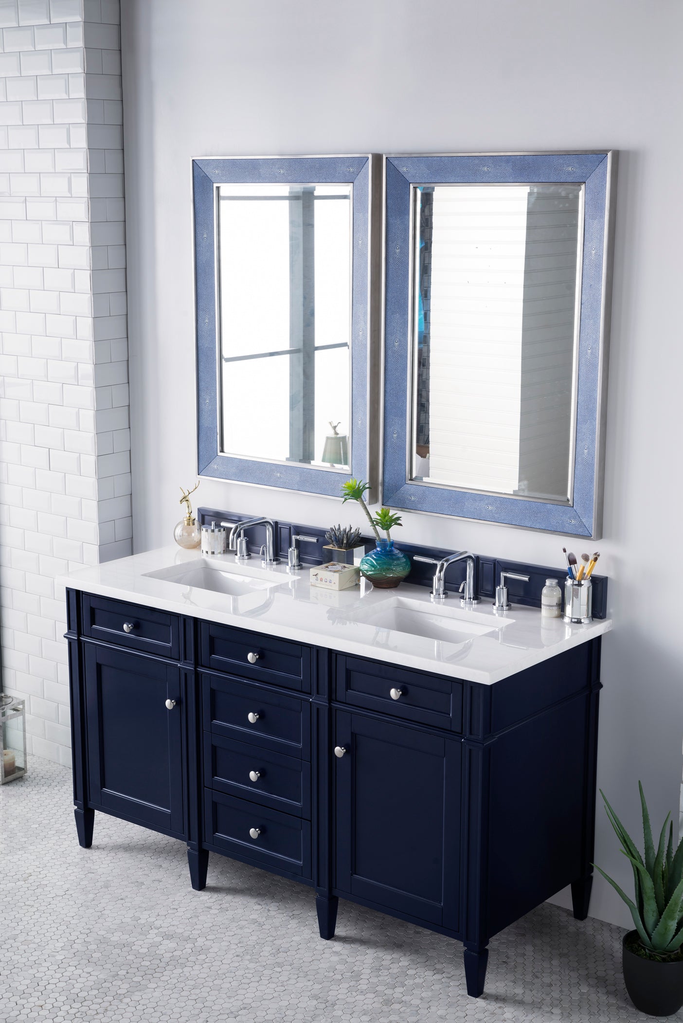 The Brittany 60" Victory Blue Double Vanity by James Martin Vanities features classic details that bridge both traditional and transitional styles. This beautiful piece of furniture includes two hide-away tip-out, top row drawers and four full-depth drawers. This cabinet also has two doors, which conceal an interior shelf for ample storage. Handcrafted in yellow poplar solids and veneers with satin nickel hardware. Matching wood backsplash is included. The look is completed with a 3 CM eased edge 3 CM eased edge Arctic Fall Solid Surface top with two white ceramic rectangular sinks.