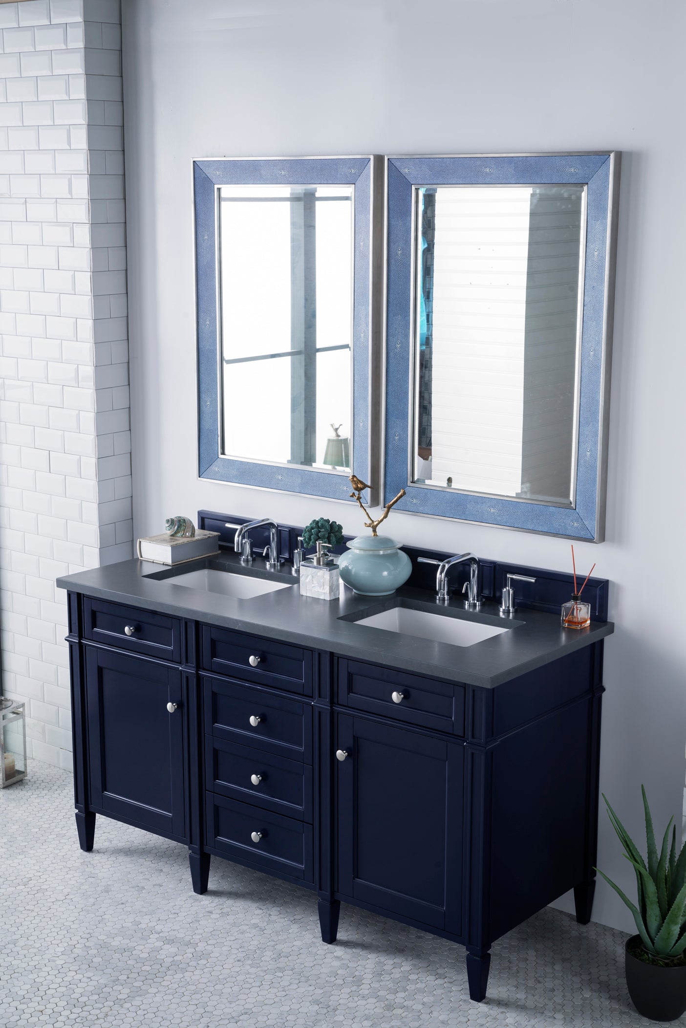 The Brittany 60" Victory Blue Double Vanity by James Martin Vanities features classic details that bridge both traditional and transitional styles. This beautiful piece of furniture includes two hide-away tip-out, top row drawers and four full-depth drawers. This cabinet also has two doors, which conceal an interior shelf for ample storage. Handcrafted in yellow poplar solids and veneers with satin nickel hardware. Matching wood backsplash is included. The look is completed with a 3 CM eased edge 3 CM eased edge Charcoal Soapstone Silestone top with two white ceramic rectangular sinks.