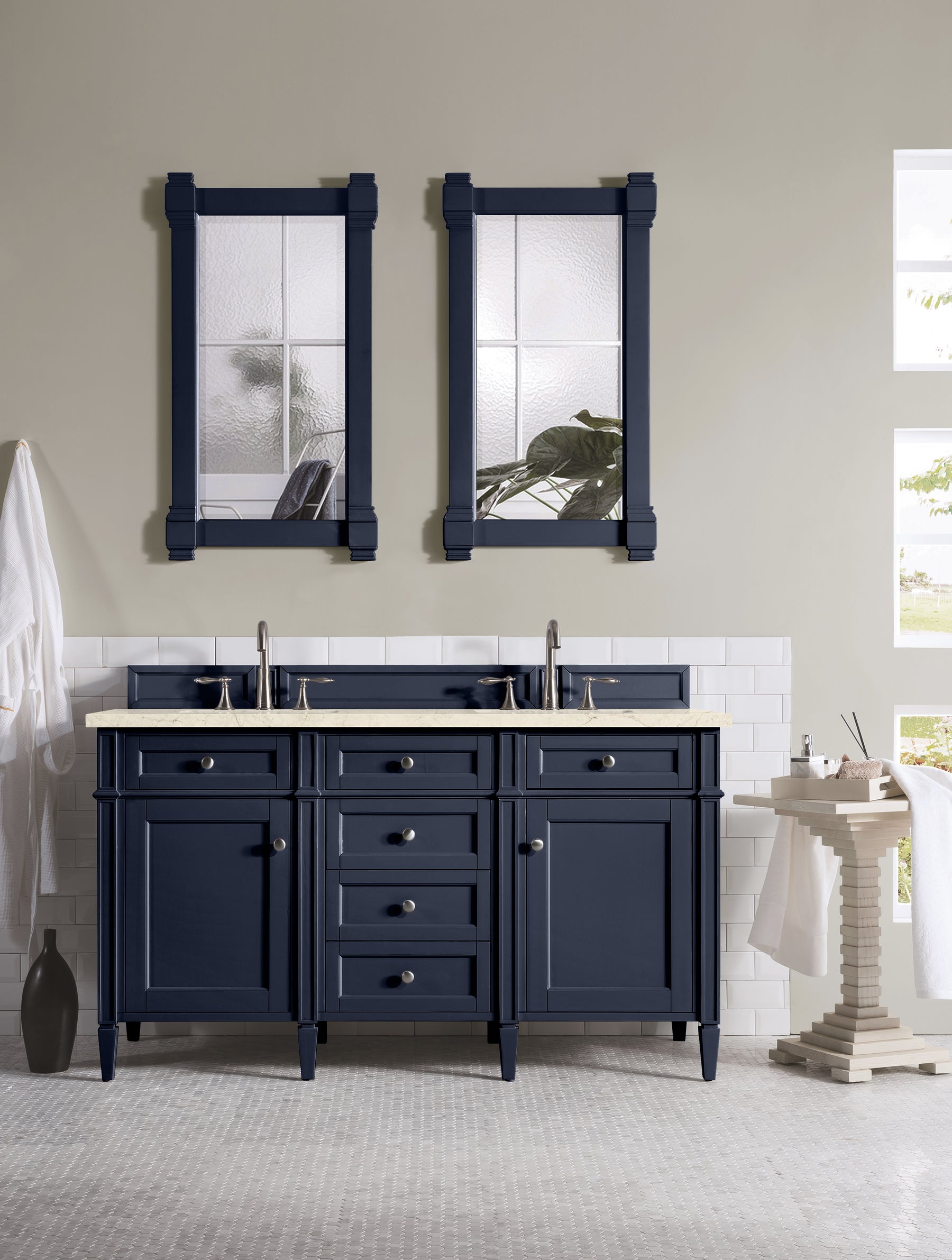 The Brittany 60" Victory Blue Double Vanity by James Martin Vanities features classic details that bridge both traditional and transitional styles. This beautiful piece of furniture includes two hide-away tip-out, top row drawers and four full-depth drawers. This cabinet also has two doors, which conceal an interior shelf for ample storage. Handcrafted in yellow poplar solids and veneers with satin nickel hardware. Matching wood backsplash is included. The look is completed with a 3 CM eased edge 3 CM eased edge Eternal Marfil Silestone top with two white ceramic rectangular sinks.