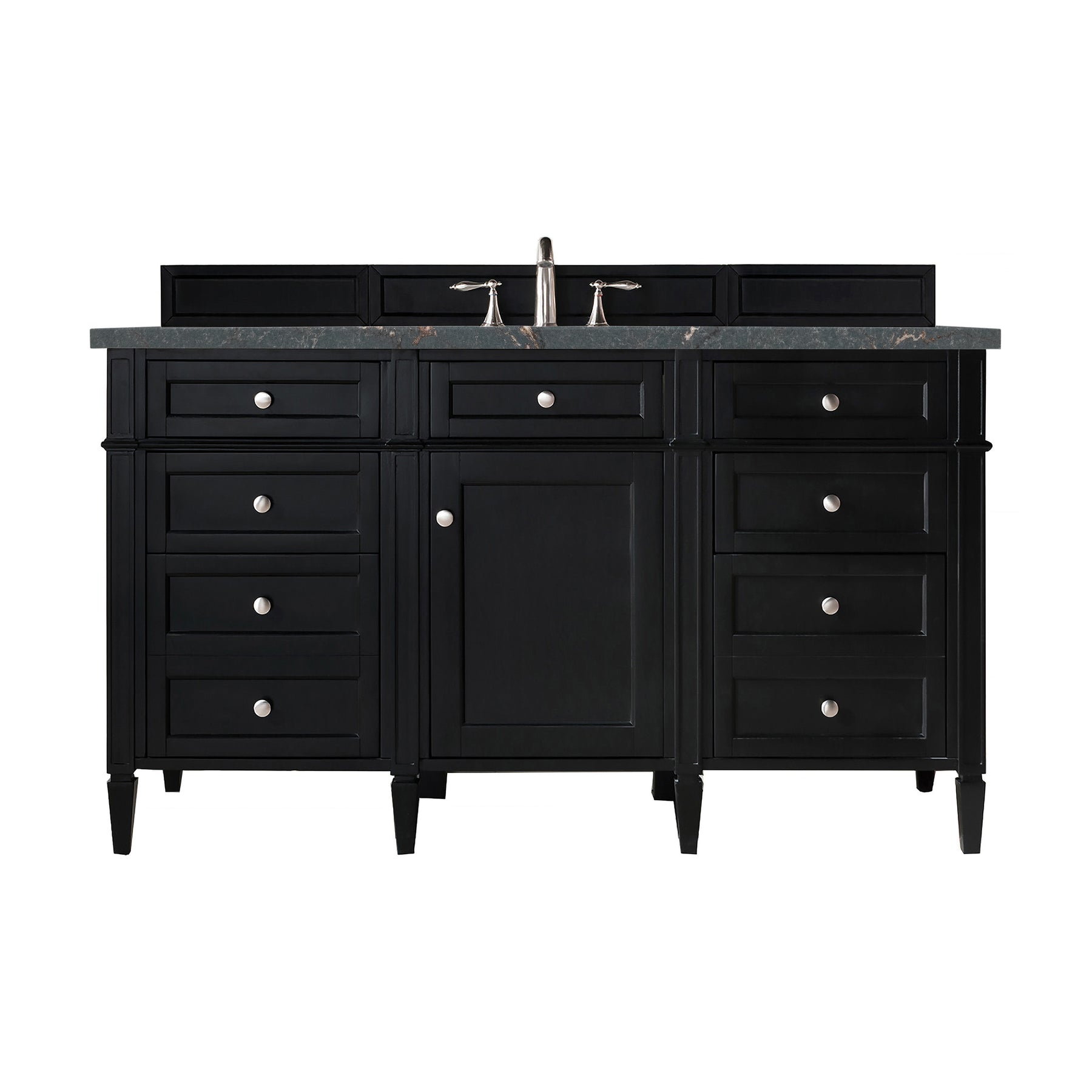 The Brittany 60" Single Vanity by James Martin Vanities features a rich Black Onyx finish and classic details that bridge both traditional and transitional styles. Featuring tapered legs and shaker-style detailing, this vanity includes one cabinet door that opens to reveal and interior shelf. Four standard full-extension drawers, two double-height drawers for storage of taller items, and one top-row tip-out drawer lend additional storage. Brittany showcases Satin Nickel hardware and comes with an optional coordinating wood backsplash. A gorgeous Parisien Bleu Silestone® top with undermount sink completes the look.