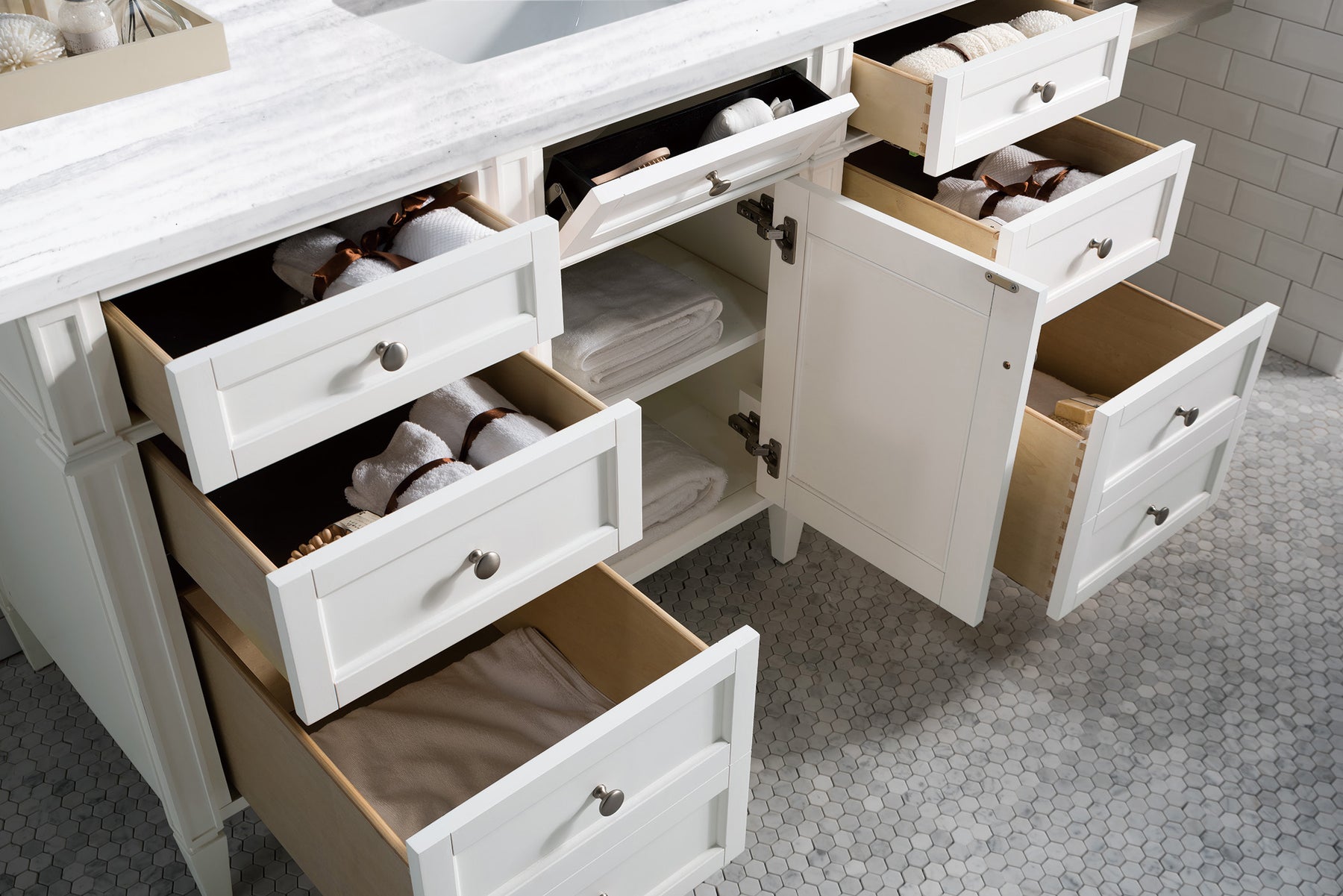 The Brittany 60" Bright White Single Vanity by James Martin Vanities features classic details that bridge both traditional and transitional styles. This beautiful piece of furniture includes one hide-away top row tip-out drawer, plus six full-depth drawers, two of which are double-height for storage of taller items. This cabinet also has one door, which conceals an interior shelf for ample storage. Hand crafted in yellow poplar solids and yellow poplar veneers with Satin Nickel hardware. Matching wood backsplash is included. Completing this beautiful vanity is a 3 cm solid surface Arctic Fall vanity top, which displays horizontal grey veining, giving you the look of classic marble with the benefits of modern technology.