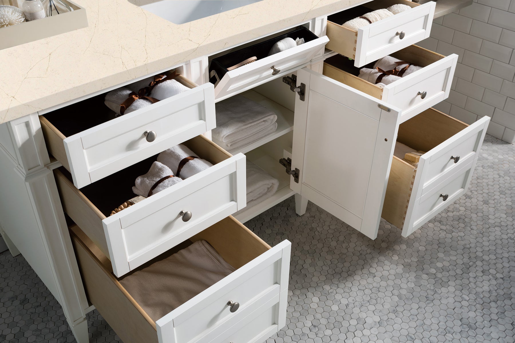 The Brittany 60" Bright White Single Vanity by James Martin Vanities features classic details that bridge both traditional and transitional styles. This beautiful piece of furniture includes one hide-away top row tip-out drawer, plus six full-depth drawers, two of which are double-height for storage of taller items. This cabinet also has one door, which conceals an interior shelf for ample storage. Hand crafted in yellow poplar solids and yellow poplar veneers with Satin Nickel hardware. Matching wood backsplash is included. The classic, warm tones of the Eternal Marfil Silestone top by Cosentino completes the look.