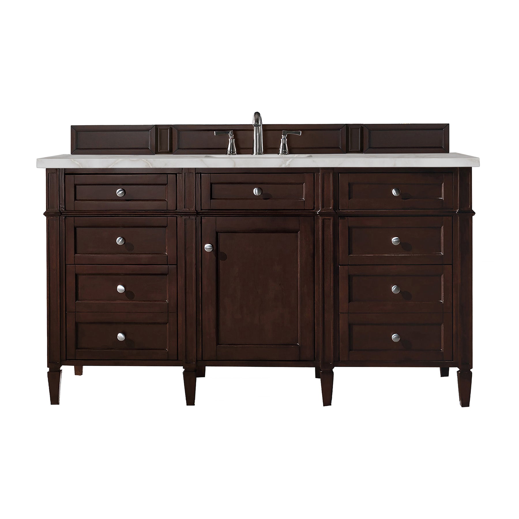 The Brittany 60" Single Vanity by James Martin Vanities features a rich Burnished Mahogany finish and classic details that bridge both traditional and transitional styles. Featuring tapered legs and shaker-style detailing, this vanity includes one cabinet door that opens to reveal and interior shelf. Four standard full-extension drawers, two double-height drawers for storage of taller items, and one top-row tip-out drawer lend additional storage. Brittany showcases Satin Nickel hardware and comes with an optional coordinating wood backsplash. A stunning Victorian Silver Silestone® top with undermount sink completes the look.