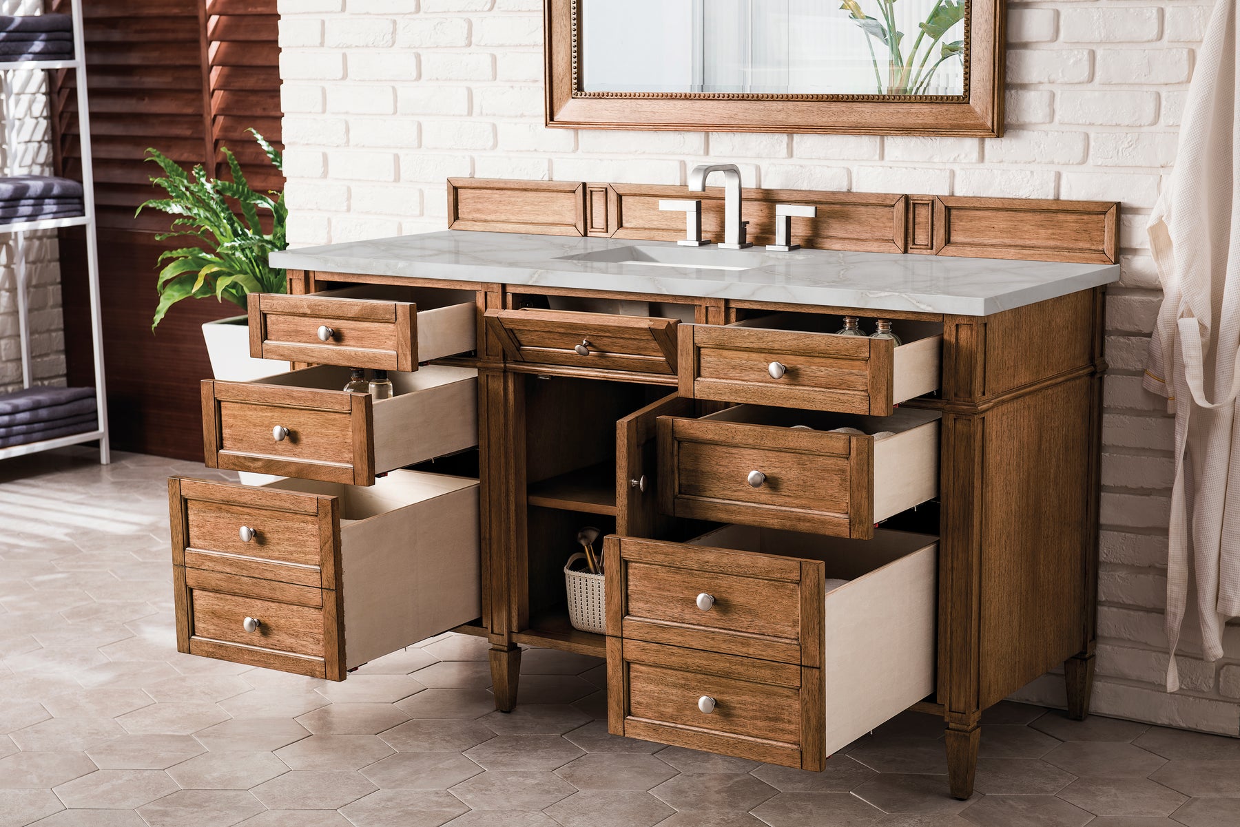 The Brittany 60" Saddle Brown Single Vanity by James Martin Vanities features classic details that bridge both traditional and transitional styles. This beautiful piece of furniture includes one hide-away top row tip-out drawer, plus six full-depth drawers, two of which are double-height for storage of taller items. This cabinet also has one door, which conceals an interior shelf for ample storage. Handcrafted in yellow Poplar solids and veneers with satin nickel hardware. Matching wood backsplash is included. The look is completed with a 3 CM eased-edge countertop by Cosentino in Victorian Silver, which features a cool background tone with silver and dark neutral veins, complimented with champagne metallic accents. It includes pre-drilled holes for an 8-inch widespread faucet (not included), one white porcelain rectangular sink, as well as the appropriate mounting brackets for installation.