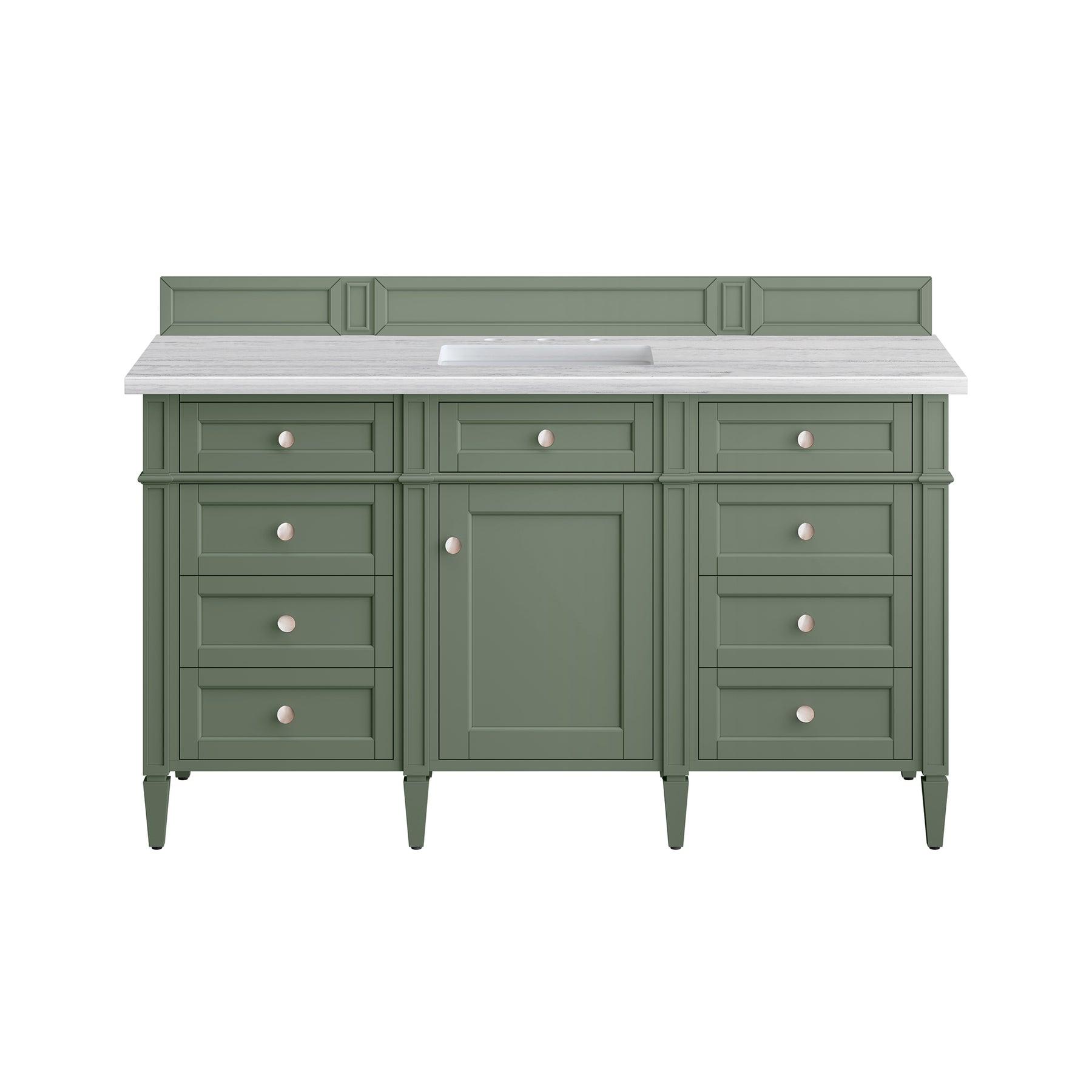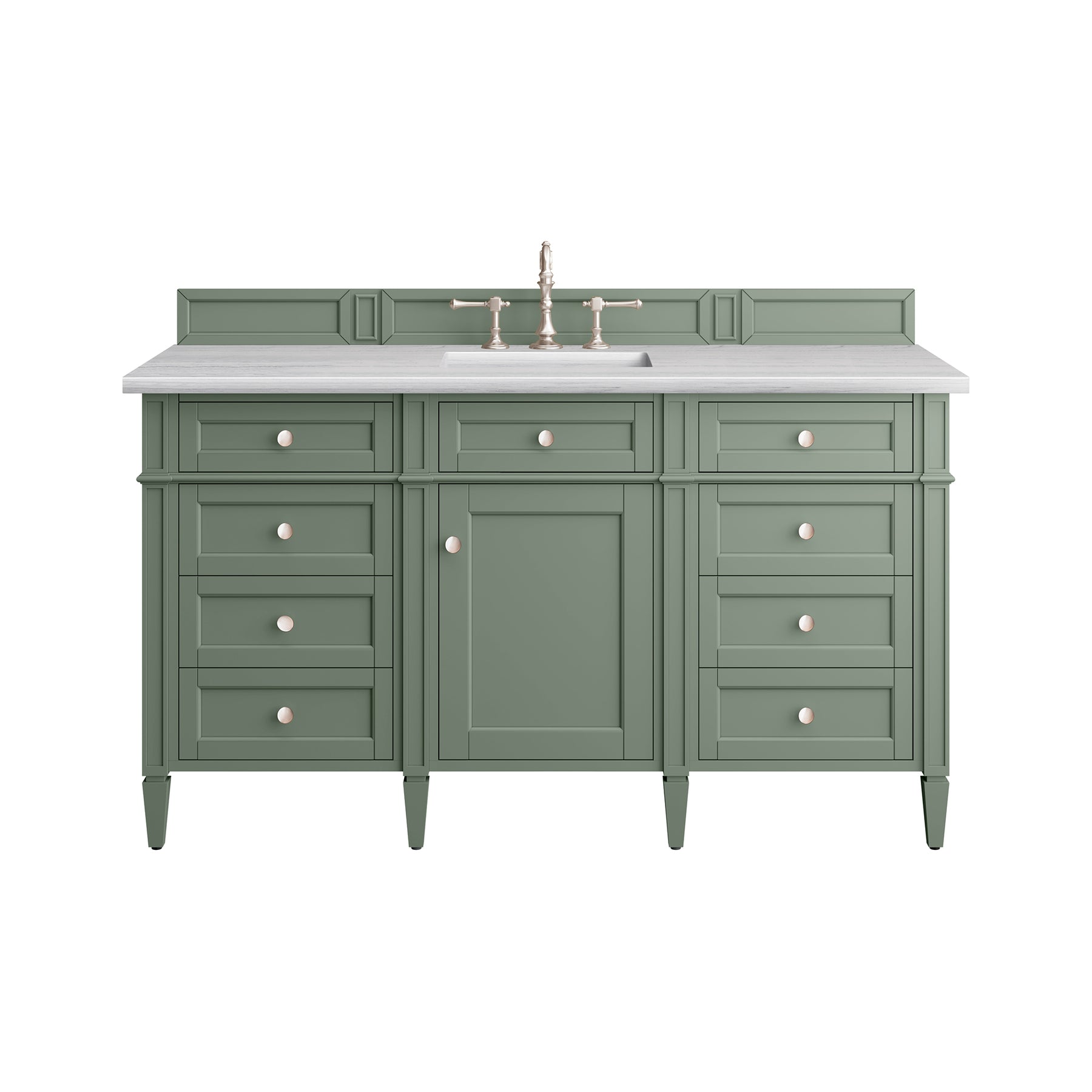 The Smokey Celadon finish on the 60" Brittany Vanity adds a refreshing, natural element to any bathroom space. This moody, yet muted green, with subtle blue and grey undertones, brings the rich, timeless details of the Brittany collection to life. The 60" cabinet, with decorative wood backsplash, features optimal organization with one hide-away tip-out drawer plus six side drawers, two of which are double height for storing taller items. This cabinet also has one door, which conceals an interior shelf. All drawers are lined with an aluminum laminate surface for easy cleaning and are equipped with undermount soft-close slides. The Arctic Fall Solid Surface top adds an exquisite, modern touch with its soft white finish, grey undertones, and a natural-looking greyish horizontal veining. All of our 3 CM tops include a porcelain undermount sink.