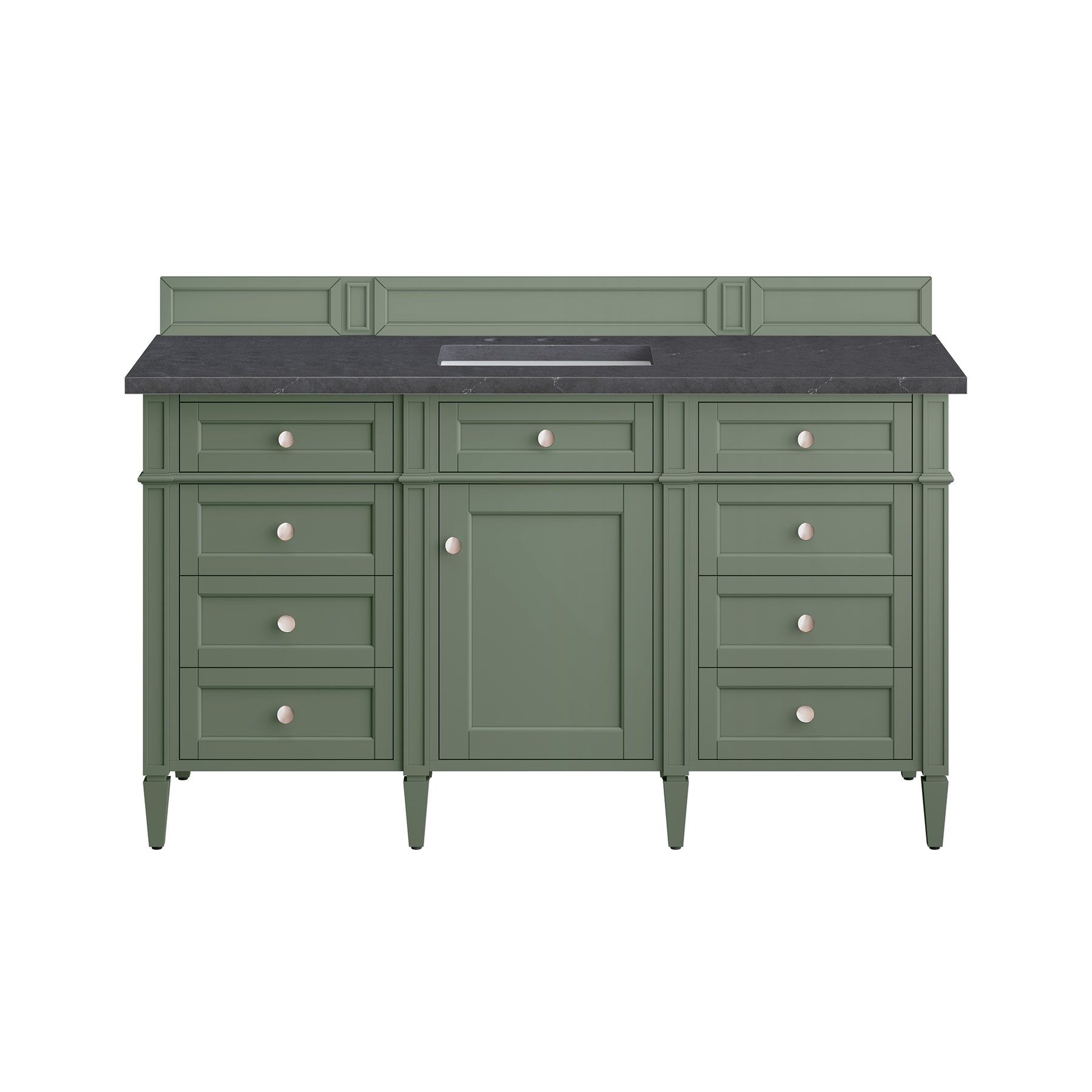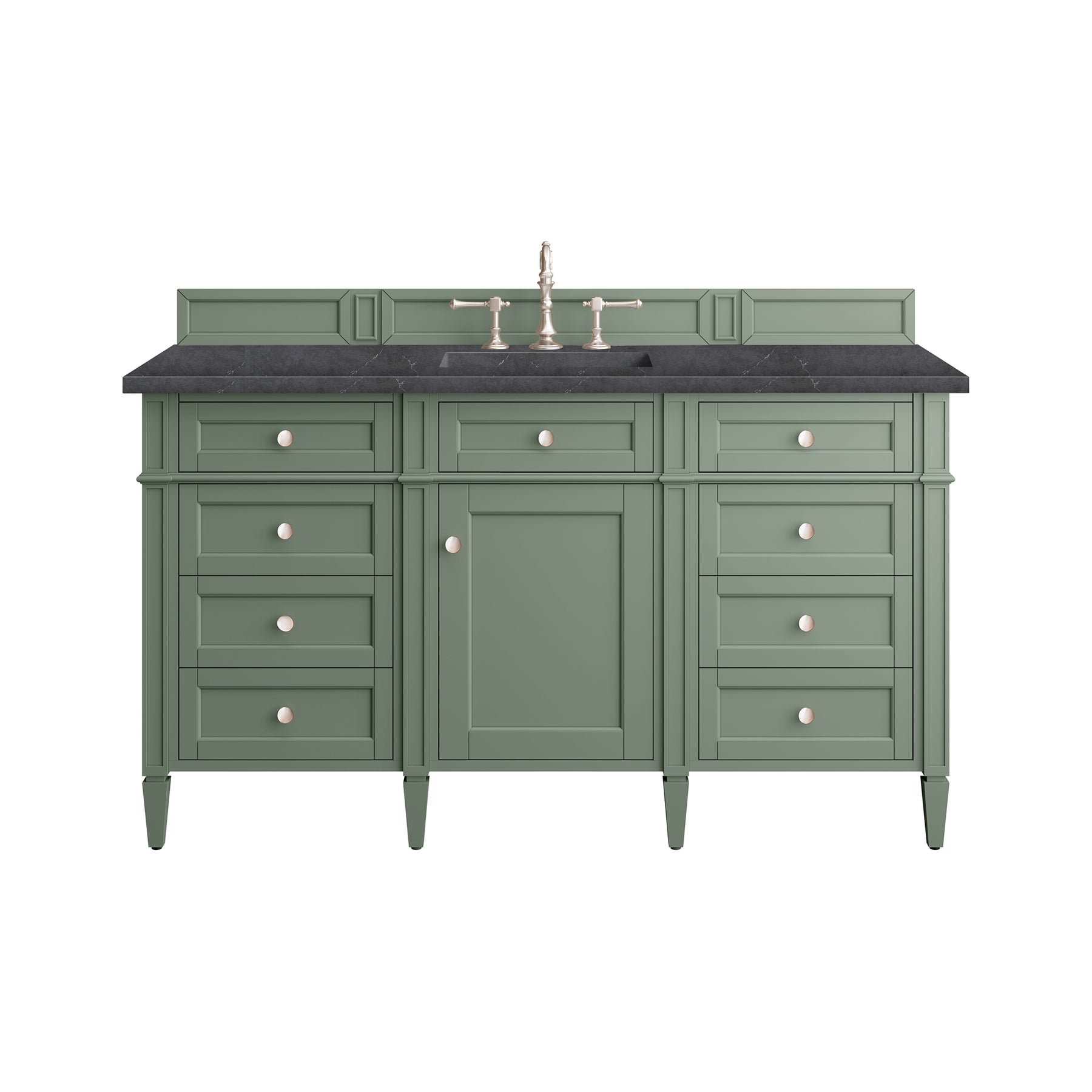 The Smokey Celadon finish on the 60" Brittany Vanity adds a refreshing, natural element to any bathroom space. This moody, yet muted green, with subtle blue and grey undertones, brings the rich, timeless details of the Brittany collection to life. The 60" cabinet, with decorative wood backsplash, features optimal organization with one hide-away tip-out drawer plus six side drawers, two of which are double height for storing taller items. This cabinet also has one door, which conceals an interior shelf. All drawers are lined with an aluminum laminate surface for easy cleaning and are equipped with undermount soft-close slides. The dark, rich contrast of the Charcoal Soapstone 3 CM Silestone top plays beautifully against the Smokey Celadon finish. All of our 3 CM tops include a porcelain undermount sink.