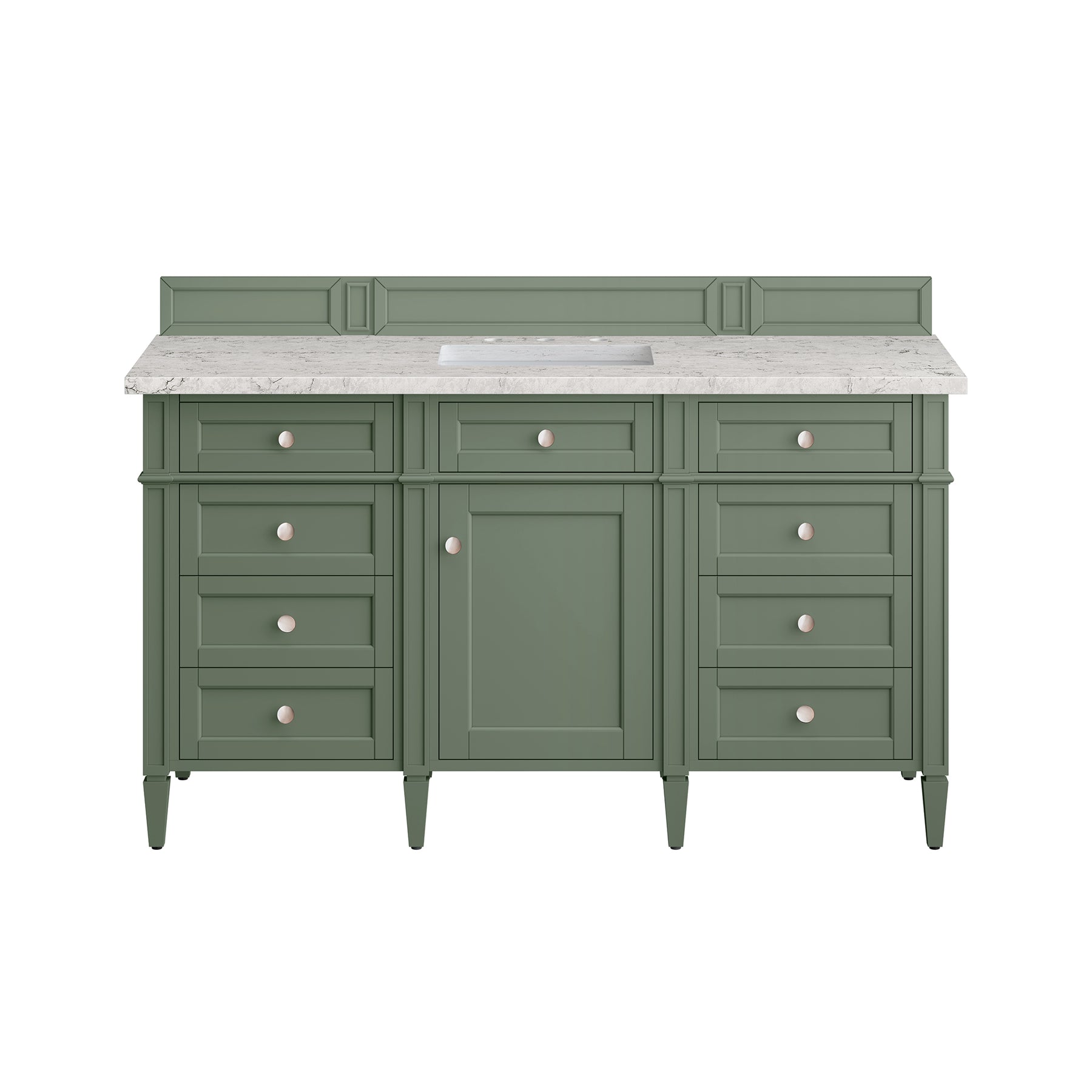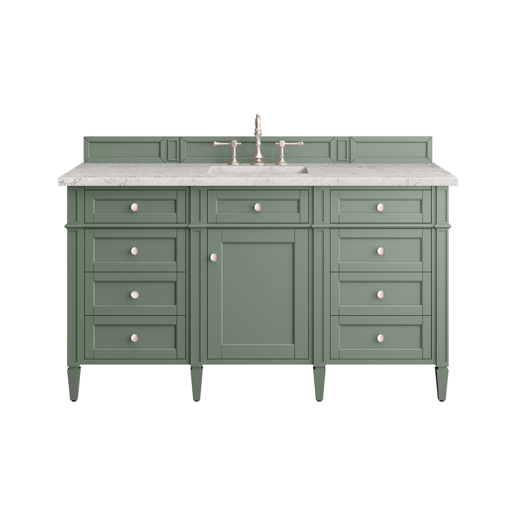 The Smokey Celadon finish on the 60" Brittany Vanity adds a refreshing, natural element to any bathroom space. This moody, yet muted green, with subtle blue and grey undertones, brings the rich, timeless details of the Brittany collection to life. The 60" cabinet, with decorative wood backsplash, features optimal organization with one hide-away tip-out drawer plus six side drawers, two of which are double height for storing taller items. This cabinet also has one door, which conceals an interior shelf. All drawers are lined with an aluminum laminate surface for easy cleaning and are equipped with undermount soft-close slides. The marbleized detail and neutral contrasting hues of the Eternal Jasmine Pearl Silestone top allow for a rich, elegant look. All of our 3 CM tops include a porcelain undermount sink.
