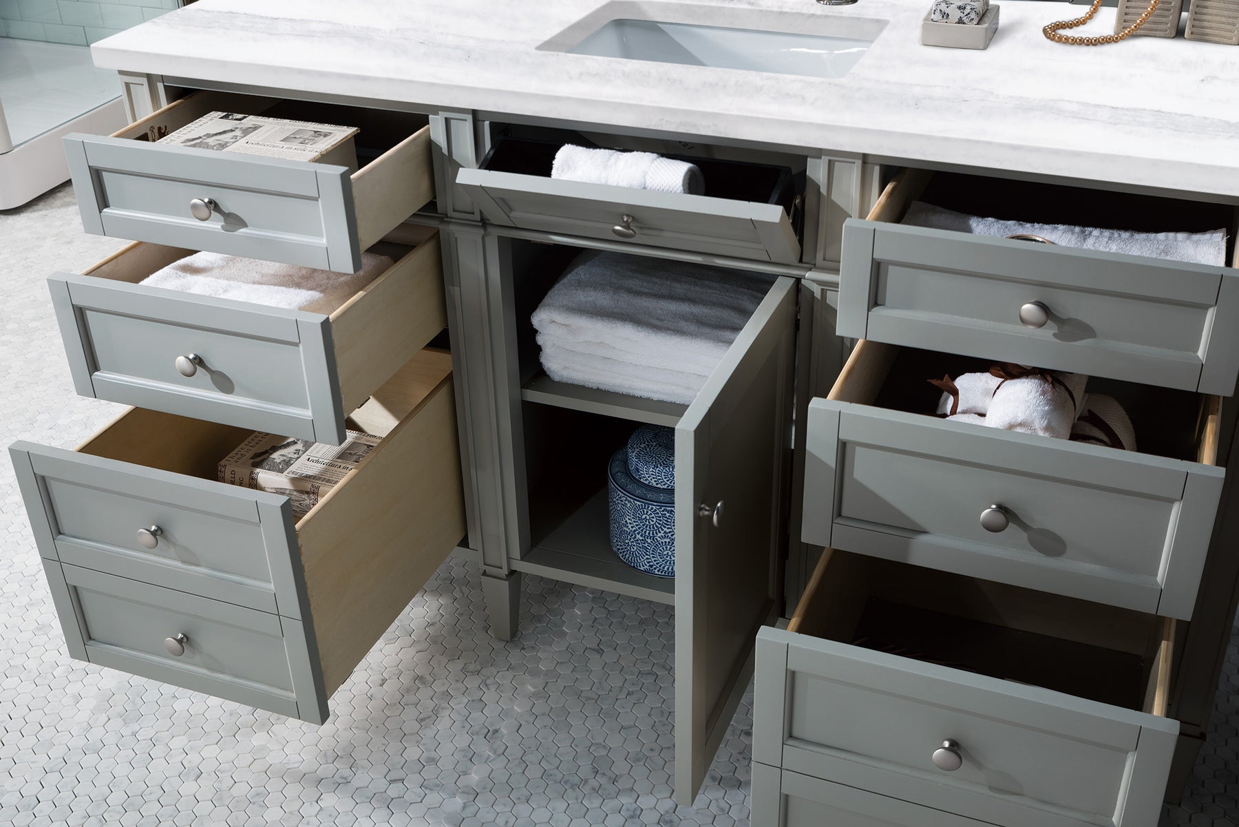 The Brittany 60" Urban Gray Single Vanity by James Martin Vanities features classic details that bridge both traditional and transitional styles. This beautiful piece of furniture includes one hide-away top row tip-out drawer and six full-depth drawers, two of which are double-height for storage of taller items. This cabinet also has one door, which conceals an interior shelf for ample storage. Handcrafted in yellow poplar solids and veneers with satin nickel hardware. Matching wood backsplash is included. The look is completed with a 3 CM eased edge 3 CM eased edge Arctic Fall Solid Surface top with one white ceramic rectangular sink.