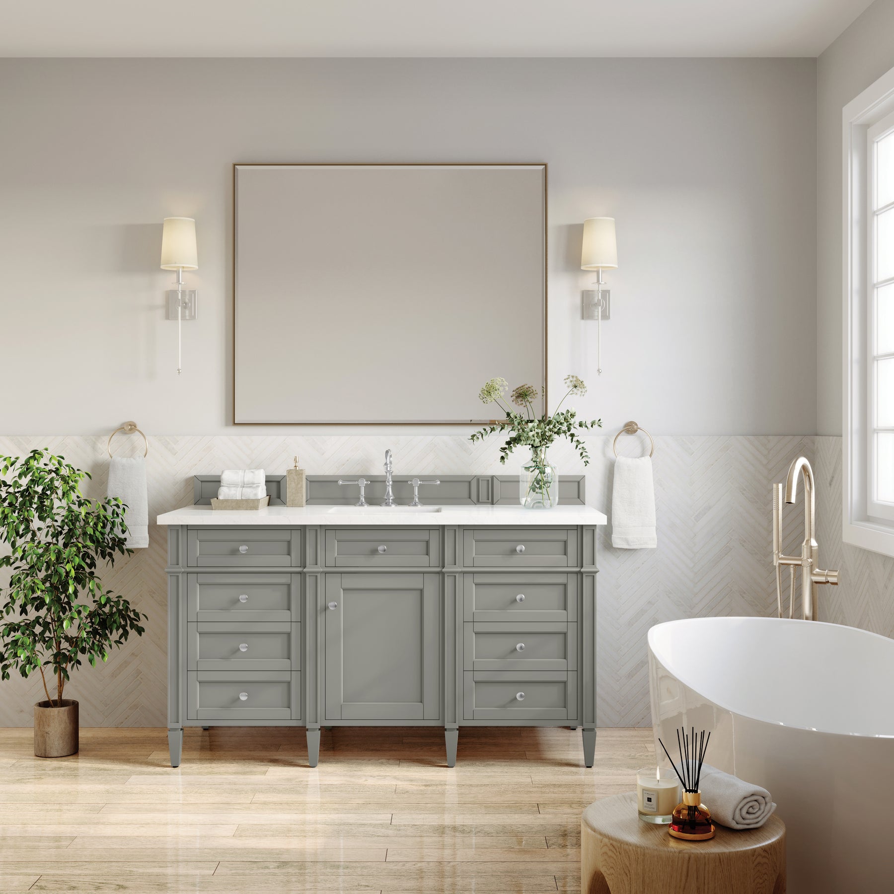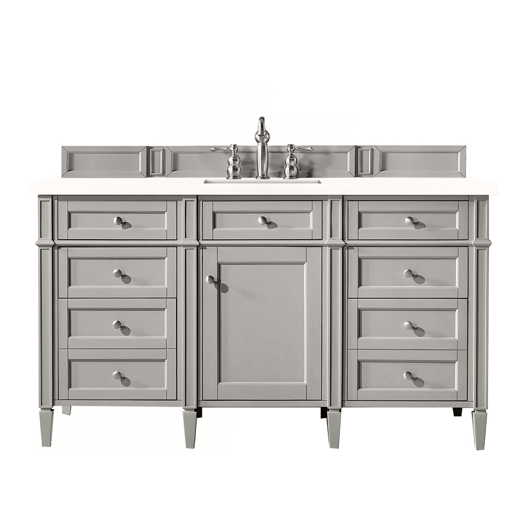 The Brittany 60" Urban Gray Single Vanity by James Martin Vanities features classic details that bridge both traditional and transitional styles. This beautiful piece of furniture includes one hide-away top row tip-out drawer, plus six full-depth drawers, two of which are double-height for storage of taller items. This cabinet also has one door, which conceals an interior shelf for ample storage. Handcrafted in yellow poplar solids and veneers with satin nickel hardware. Matching wood backsplash is included. The look is completed with a 3 CM eased edge White Zeus Silestone top by Cosentino and one white ceramic sink.