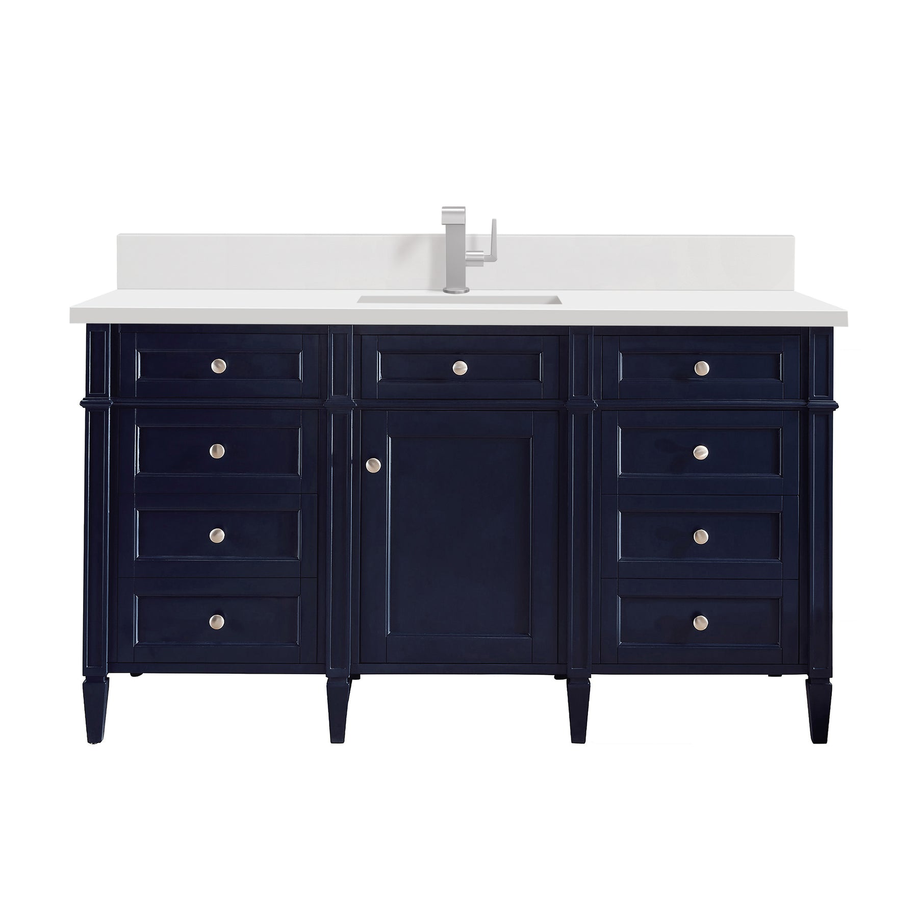 The Brittany 60" Victory Blue Single Vanity by James Martin Vanities features classic details that bridge both traditional and transitional styles. This beautiful piece of furniture includes one hide-away top row tip-out drawer, plus six full-depth drawers, two of which are double-height for storage of taller items. This cabinet also has one door, which conceals an interior shelf for ample storage. Handcrafted in yellow Poplar solids and veneers with satin nickel hardware. Matching wood backsplash is included. The look is completed with a 3 CM eased-edge countertop by Cosentino in White Zeus, which gives a crisp and clean finish to your vanity. It includes one pre-drilled hole for a single-hole faucet (not included), one matching stone backsplash, one white porcelain rectangular sink, as well as the appropriate mounting brackets for installation.