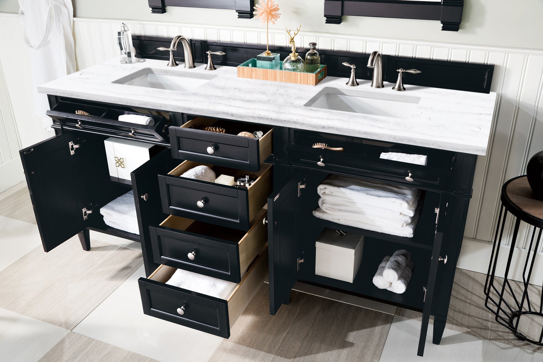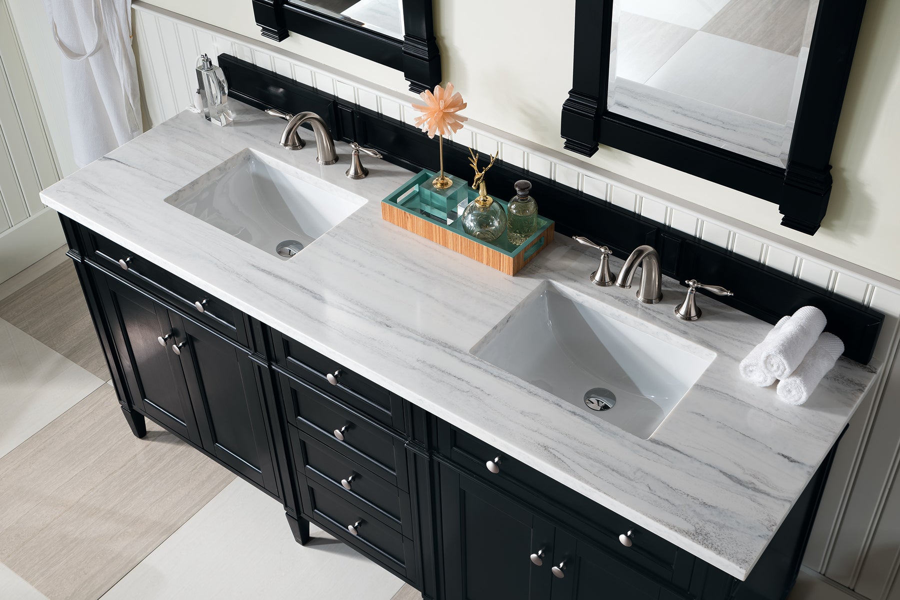 The Brittany 72" Black Onyx Double Vanity by James Martin Vanities features classic details that bridge both traditional and transitional styles. This beautiful piece of furniture includes two hide-away tip-out, top row drawers and four full-depth drawers. This cabinet also has four doors which conceal interior shelves for ample storage. Handcrafted in yellow poplar solids and veneers with satin nickel hardware. Matching wood backsplash is included. The look is completed with a 3 CM eased edge 3 CM eased edge Arctic Fall Solid Surface top with two white ceramic rectangular sinks.