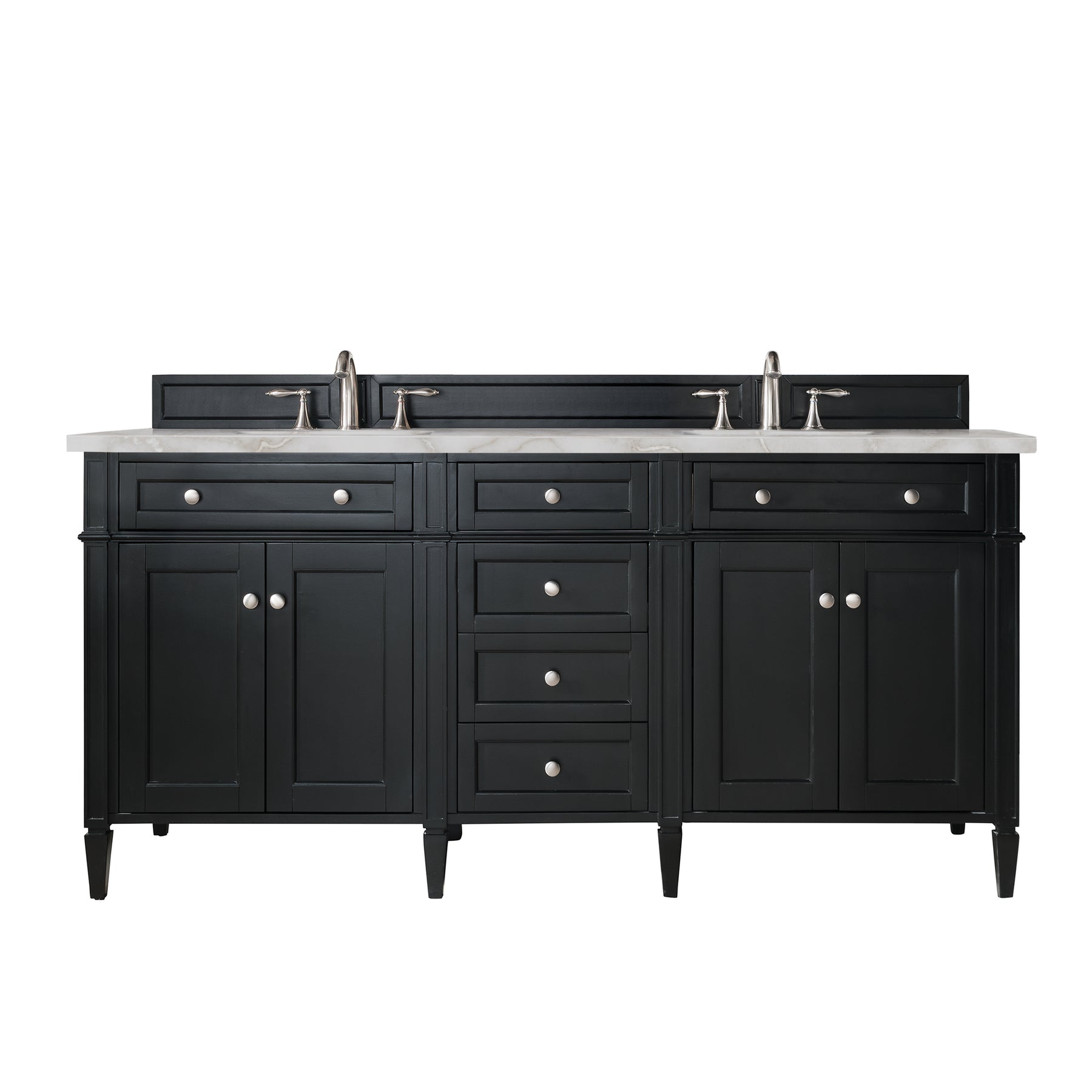 The Brittany 72" Black Onyx Double Vanity by James Martin Vanities features classic details that bridge both traditional and transitional styles. This beautiful piece of furniture includes two hide-away tip-out, top row drawers and four full-depth drawers. This cabinet also has four doors which conceal interior shelves for ample storage. Handcrafted in yellow Poplar solids and veneers with satin nickel hardware. Matching wood backsplash is included. The look is completed with a 3 CM eased-edge countertop by Cosentino in Victorian Silver, which features a cool background tone with silver and dark neutral veins, complimented with champagne metallic accents. It includes pre-drilled holes for two 8-inch widespread faucets (not included), two white porcelain rectangular sinks, as well as the appropriate mounting brackets for installation.