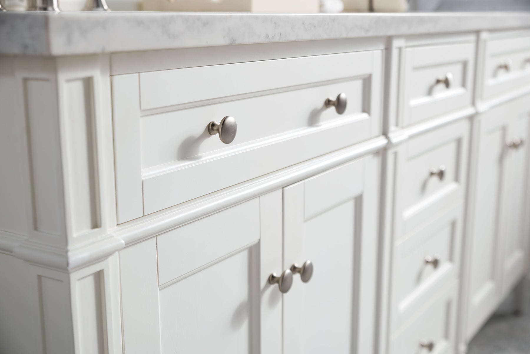 The 72" Brittany Double Vanity in Bright White by James Martin Vanities features optimal organization with two hide-away tip-out drawers plus four center drawers. This cabinet has two sets of doors, each concealing an interior shelf. All drawers are lined with an aluminum laminate surface for easy cleaning and are equipped with undermount soft-close slides. Completing this vanity are the treasured, neutral tones and textures of the Carrara marble vanity top display an white background with delicate grey veining.