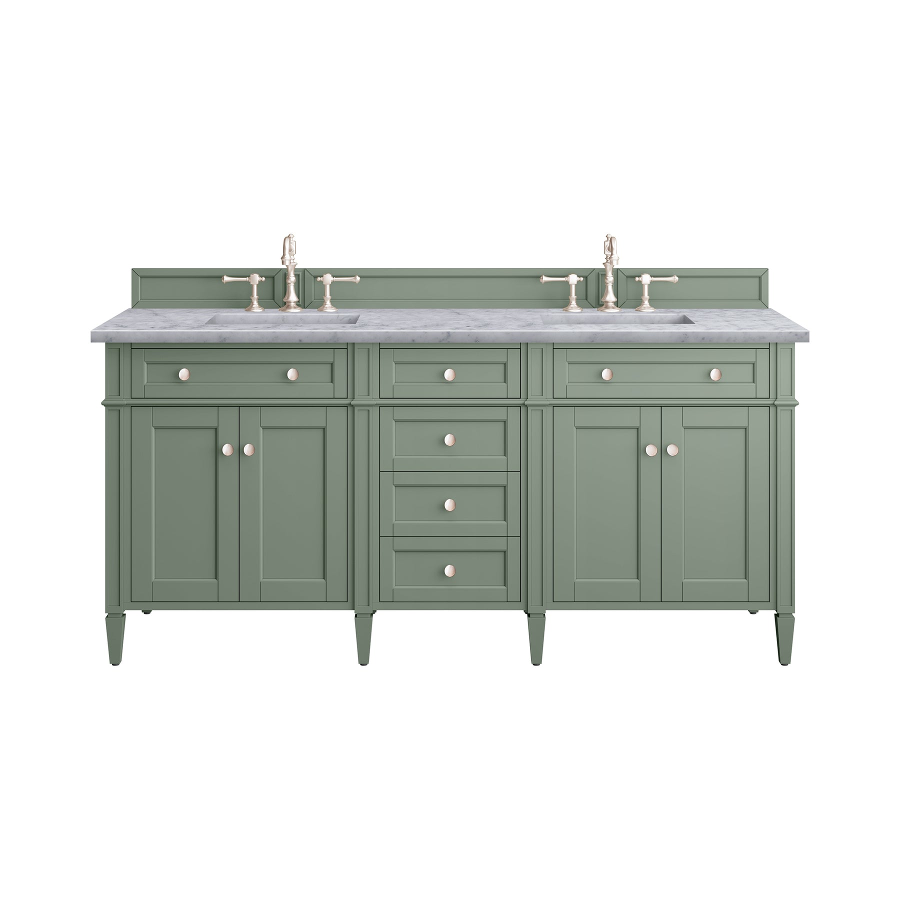The Smokey Celadon finish on the 72" Brittany Vanity adds a refreshing, natural element to any bathroom space. This moody, yet muted green, with subtle blue and grey undertones, brings the rich, timeless details of the Brittany collection to life. The 72" cabinet, with decorative wood backsplash, features optimal organization with two hide-away tip-out drawers plus four center drawers. This cabinet has two sets of doors, each concealing an interior shelf. All drawers are lined with an aluminum laminate surface for easy cleaning and are equipped with undermount soft-close slides. The natural Spanish Carrara marble top perfectly complements the green hue and the classic details of the Brittany vanity. All of our 3 CM tops include a porcelain undermount sink.