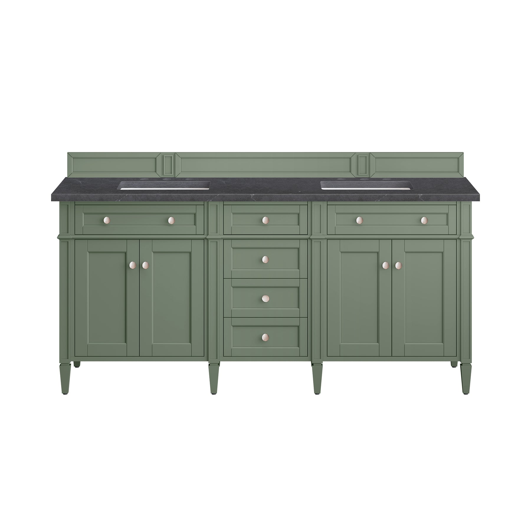 The Smokey Celadon finish on the 72" Brittany Vanity adds a refreshing, natural element to any bathroom space. This moody, yet muted green, with subtle blue and grey undertones, brings the rich, timeless details of the Brittany collection to life. The 72" cabinet, with decorative wood backsplash, features optimal organization with two hide-away tip-out drawers plus four center drawers. This cabinet has two sets of doors, each concealing an interior shelf. All drawers are lined with an aluminum laminate surface for easy cleaning and are equipped with undermount soft-close slides. The dark, rich contrast of the Charcoal Soapstone 3 CM Silestone top plays beautifully against the Smokey Celadon finish. All of our 3 CM tops include a porcelain undermount sink.