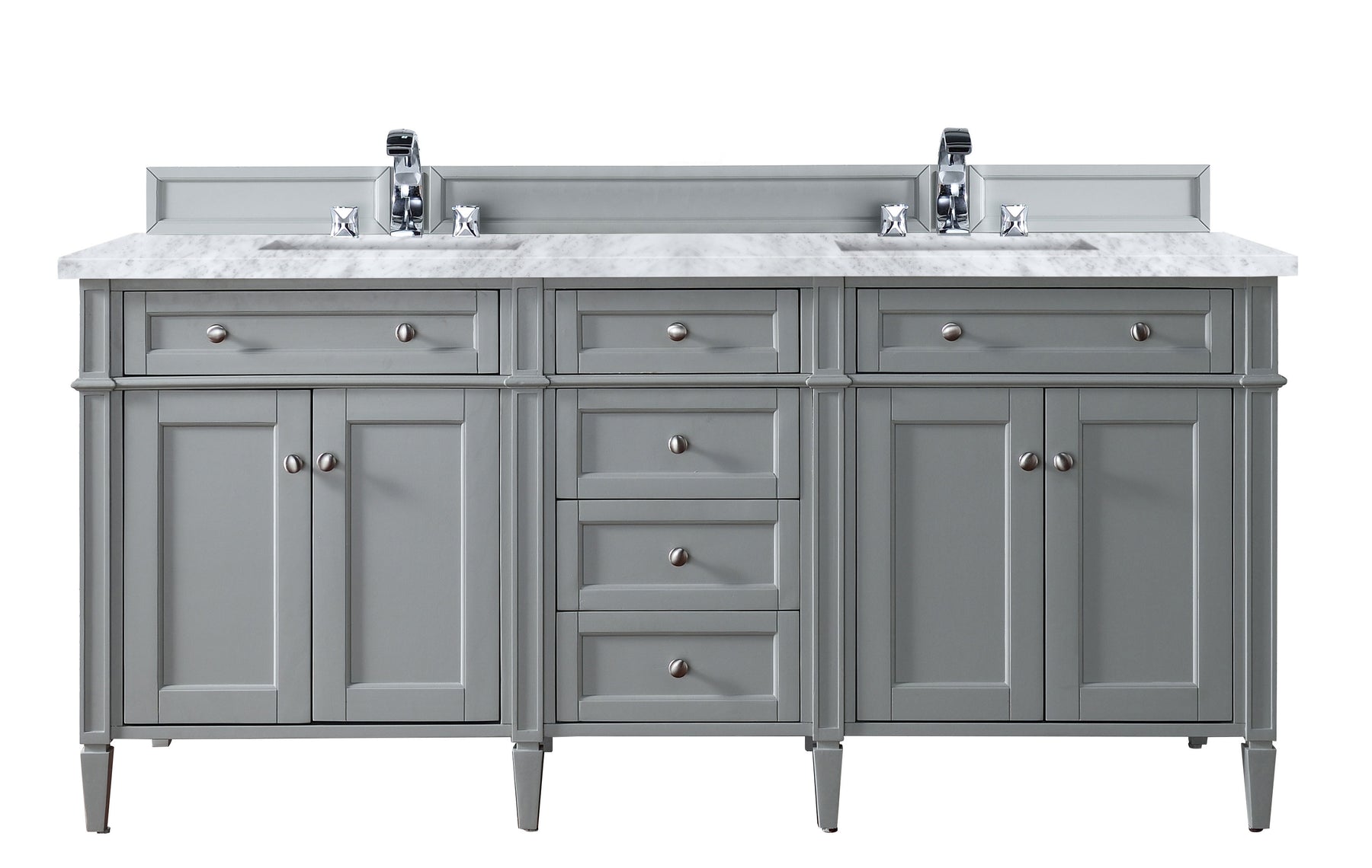 The Brittany 72" Urban Gray Double Vanity by James Martin Vanities features classic details that bridge both traditional and transitional styles. This beautiful piece of furniture includes two hide-away tip-out, top row drawers and four full-depth drawers. This cabinet also has four doors which conceal interior shelves for ample storage. Handcrafted in yellow poplar solids and veneers with satin nickel hardware. Matching wood backsplash is included. The look is completed with a 3 CM eased edge 3 CM eased edge Carrara Marble top with two white ceramic rectangular sinks.