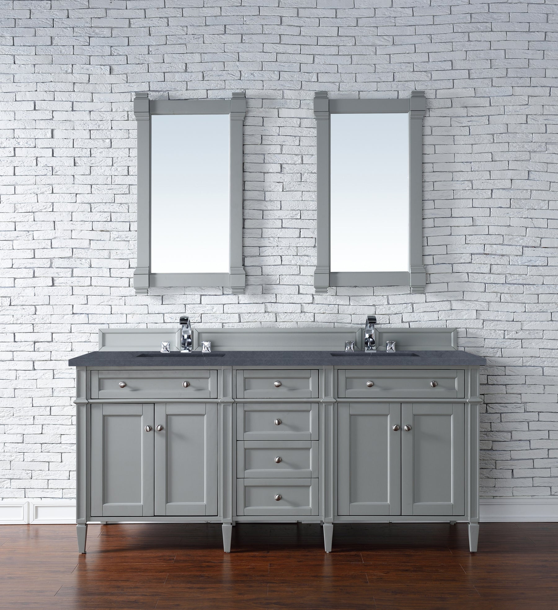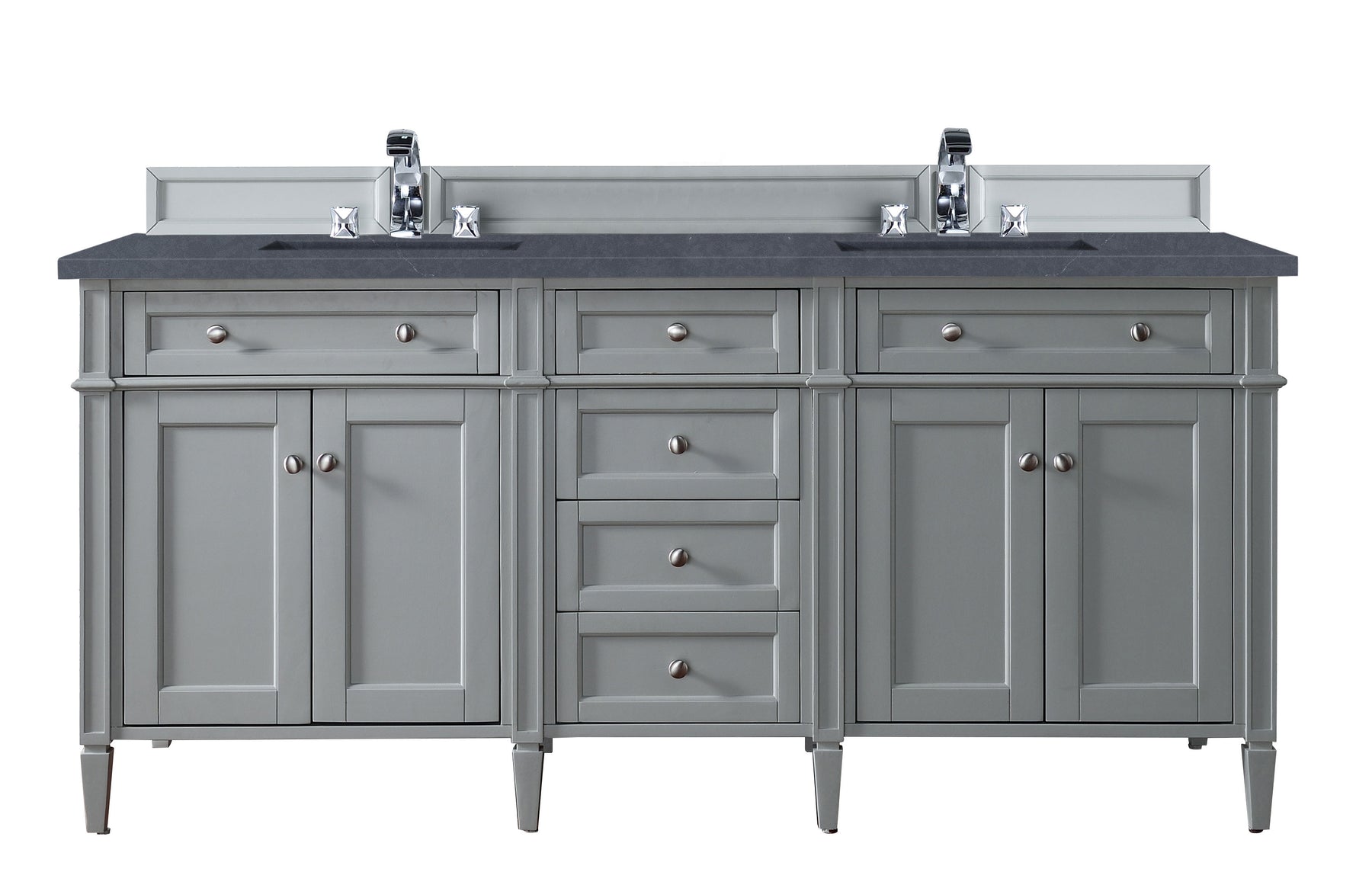 The Brittany 72" Urban Gray Double Vanity by James Martin Vanities features classic details that bridge both traditional and transitional styles. This beautiful piece of furniture includes two hide-away tip-out, top row drawers and four full-depth drawers. This cabinet also has four doors which conceal interior shelves for ample storage. Handcrafted in yellow poplar solids and veneers with satin nickel hardware. Matching wood backsplash is included. The look is completed with a 3 CM eased edge 3 CM eased edge Charcoal Soapstone Silestone top with two white ceramic rectangular sinks.