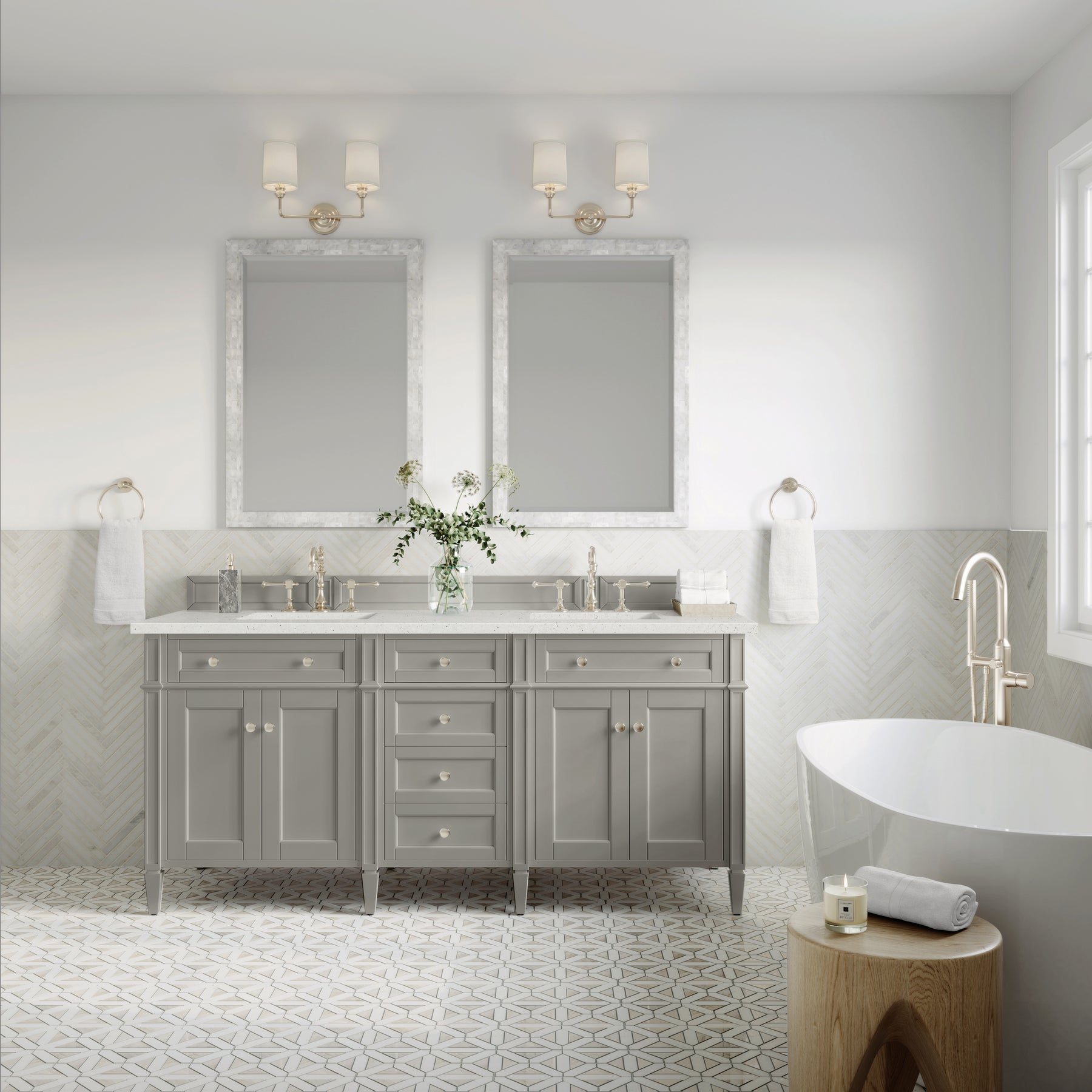 The Brittany 72" Urban Gray Double Vanity by James Martin Vanities features classic details that bridge both traditional and transitional styles. This beautiful piece of furniture includes two hide-away tip-out, top row drawers and four full-depth drawers. This cabinet also has four doors which conceal interior shelves for ample storage. Handcrafted in yellow Poplar solids and veneers with satin nickel hardware. Matching wood backsplash is included. The look is completed with a 3 CM eased-edge countertop by Cosentino in Lime Delight, which brings a warm, textured beige tones in a suede finish. It includes pre-drilled holes for two 8-inch widespread faucets (not included), two white porcelain rectangular sinks, as well as the appropriate mounting brackets for installation.