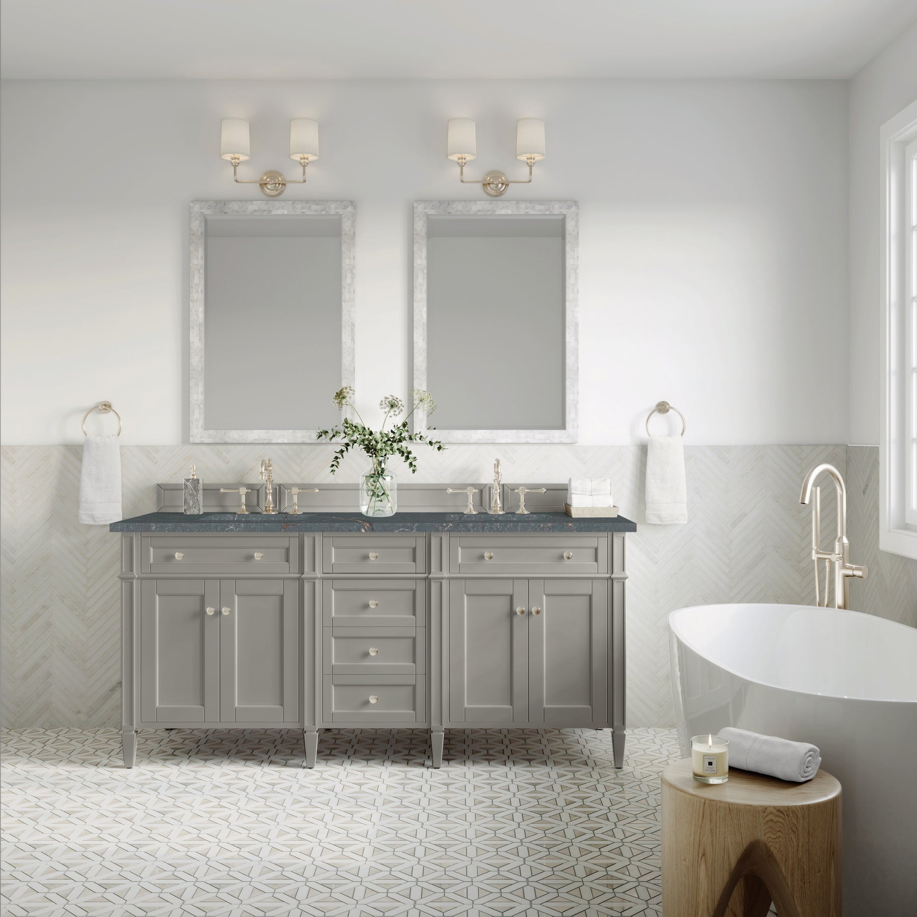 The Brittany 72" Urban Gray Double Vanity by James Martin Vanities features classic details that bridge both traditional and transitional styles. This beautiful piece of furniture includes two hide-away tip-out, top row drawers and four full-depth drawers. This cabinet also has four doors which conceal interior shelves for ample storage. Handcrafted in yellow Poplar solids and veneers with satin nickel hardware. Matching wood backsplash is included. The look is completed with a 3 CM eased-edge countertop by Cosentino in Parisien Bleu, featuring intricate neutral veining and striking coppery accents coursing through deep blue hues. It includes pre-drilled holes for two 8-inch widespread faucets (not included), two white porcelain rectangular sinks, as well as the appropriate mounting brackets for installation.