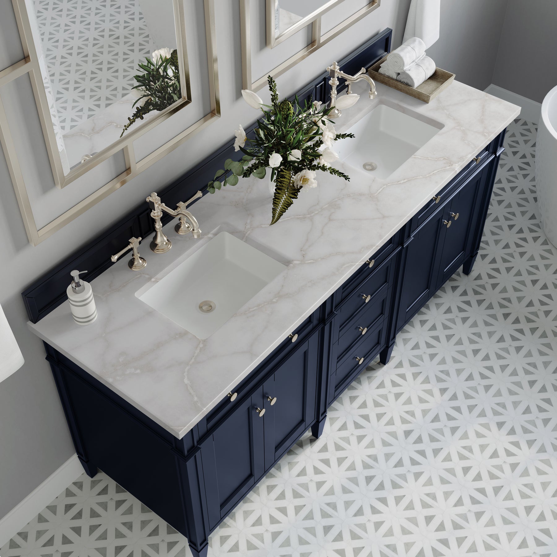 The Brittany 72" Double Vanity by James Martin Vanities features a Victory Blue finish and classic details that bridge both traditional and transitional styles. Featuring tapered legs and shaker-style detailing, this vanity includes four cabinet doors that open to reveal interior shelving. Four standard full-extension drawers and two top-row tip-out drawers lend additional storage. Brittany showcases Satin Nickel hardware and comes with an optional coordinating wood backsplash. A stunning Victorian Silver Silestone® top with undermount sinks completes the look.