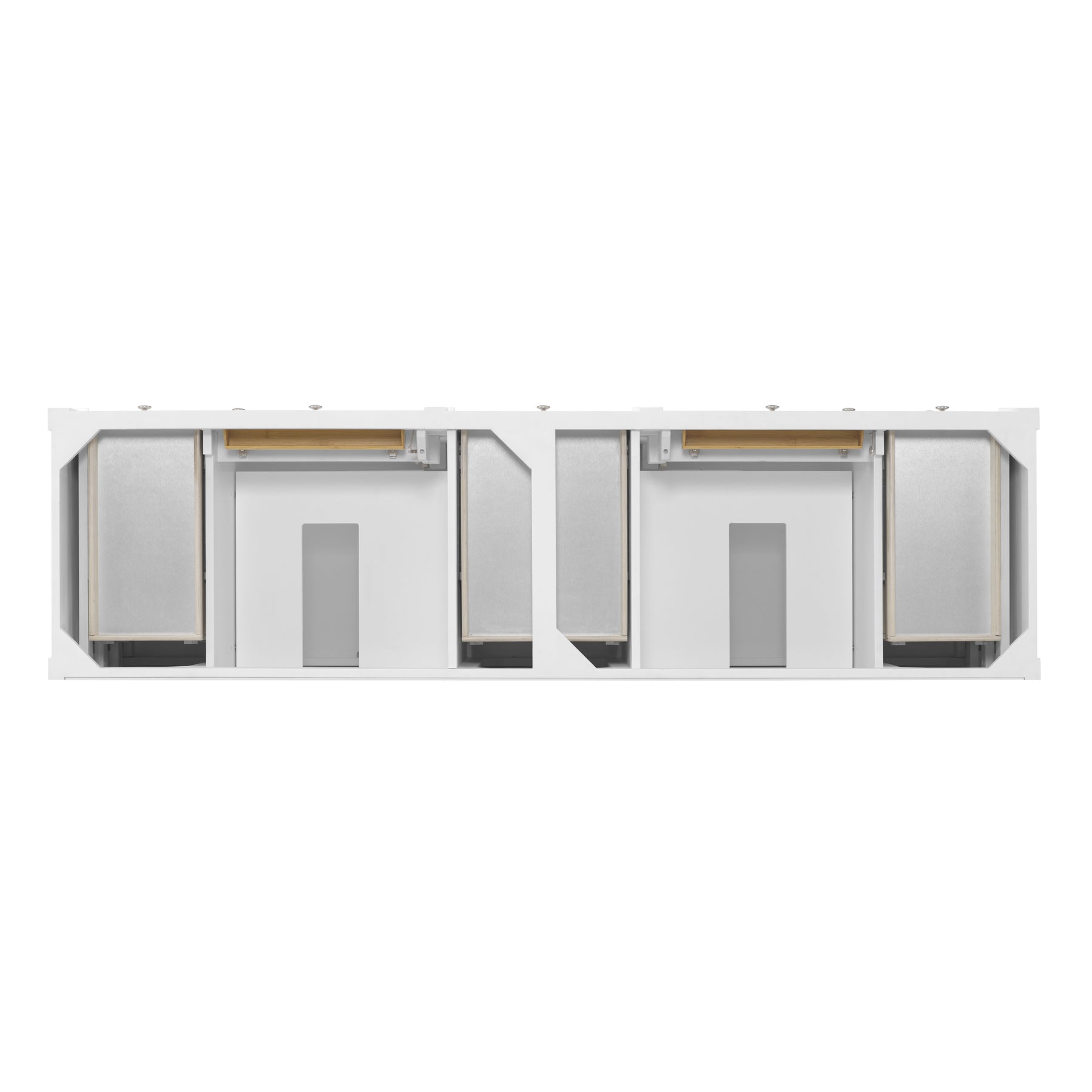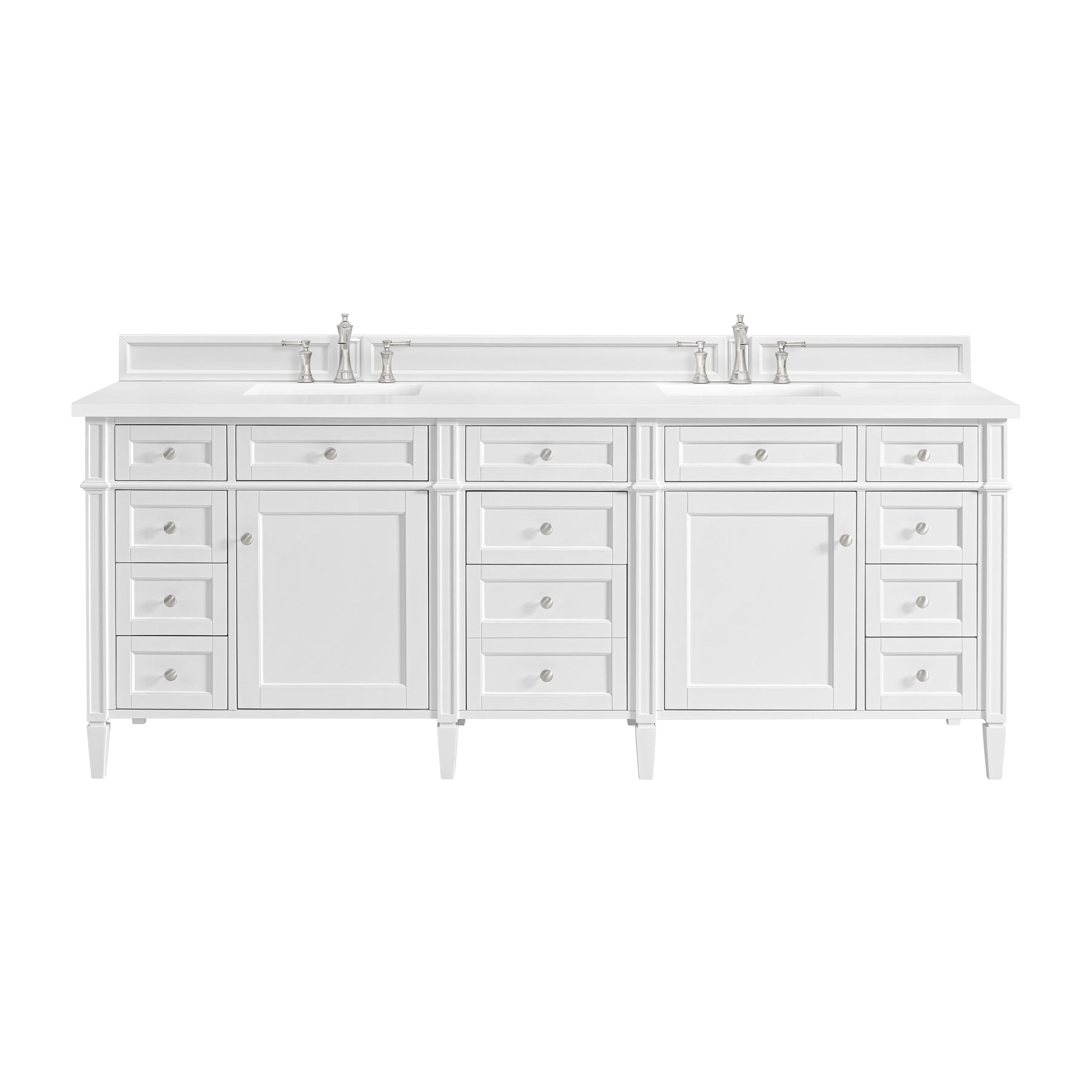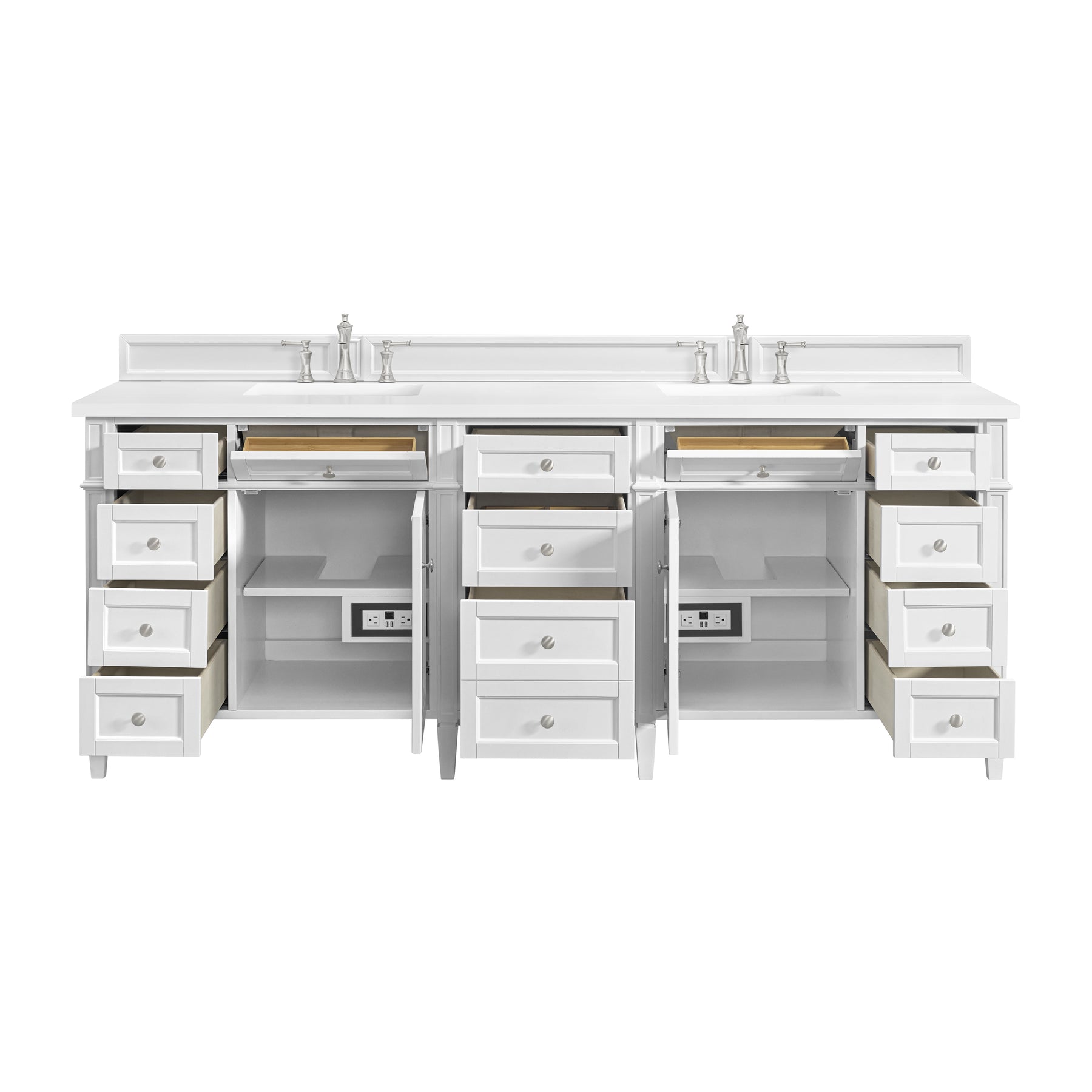 The 84" Brittany Double Vanity in Bright White by James Martin Vanities features optimal organization with two soft-close tip-out drawers with removable bamboo inserts and 11 full-extension drawers, all of which are lined with an aluminum laminate surface for easy cleaning and feature soft-close undermount glides. This cabinet has two doors, each concealing an interior shelf with integrated electric/USB ports. This vanity set includes a 3cm eased edge White Zeus Silestone top that is predrilled for two 8" widespread faucets and two rectangular undermount sinks. Faucets are not included.