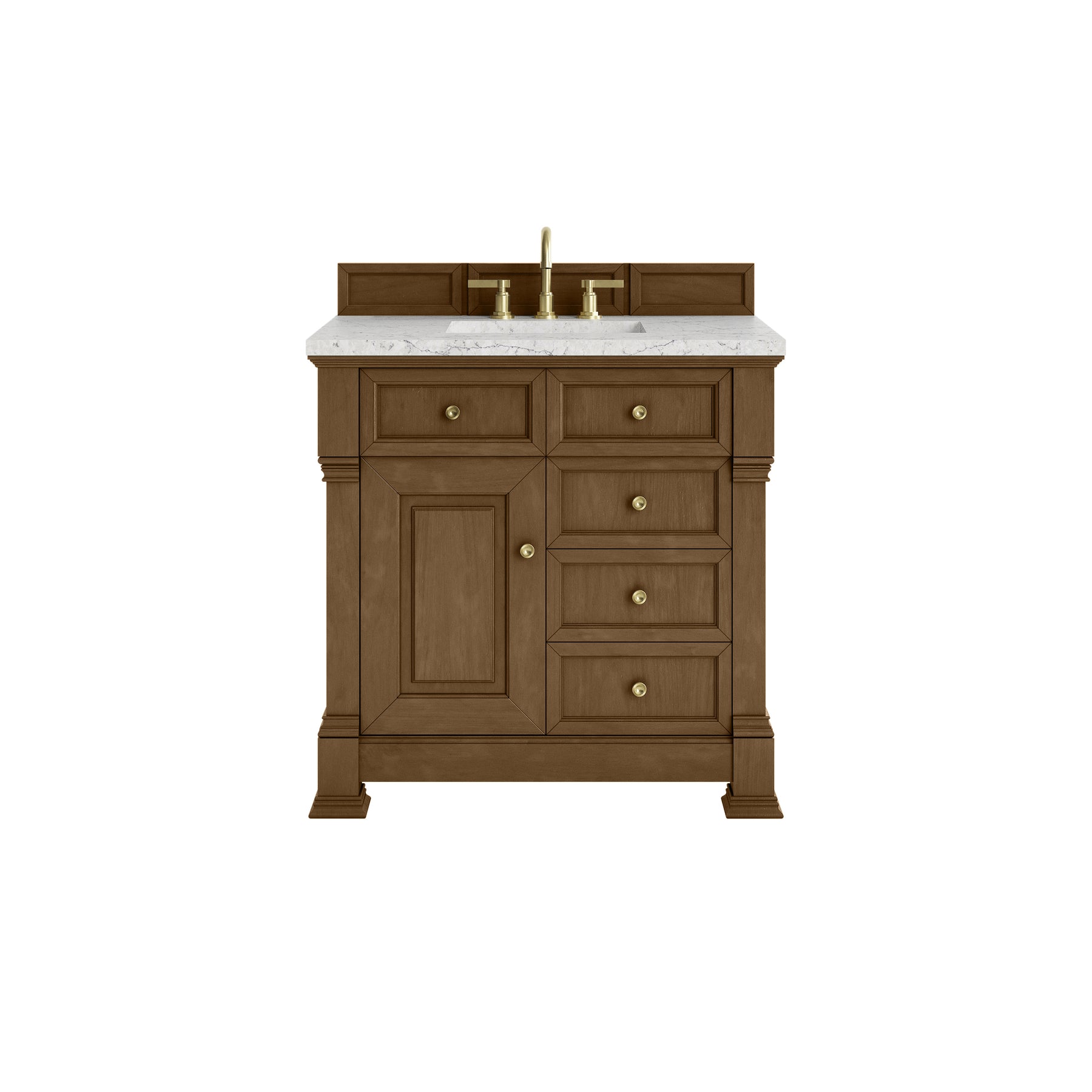 The Brookfield 36" Single Vanity in Honey Oak by James Martin Vanities offers a blend of traditional elegance and contemporary sophistication. The raised panel picture frame doors and detailed corner molding reflect timeless craftsmanship, while the warm Honey Oak finish and Champagne Brass hardware lend a fresh, modern appeal. This beautifully crafted vanity features a single-door cabinet with an interior shelf, a double-height drawer for added versatility, and two standard drawers for ample storage. The warm wood tones highlight the natural Oak wood grains, lending sophistication and charm to your space. The addition of an Eternal Jasmine Pearl SilestoneĀ® top with undermount sink completes the look.