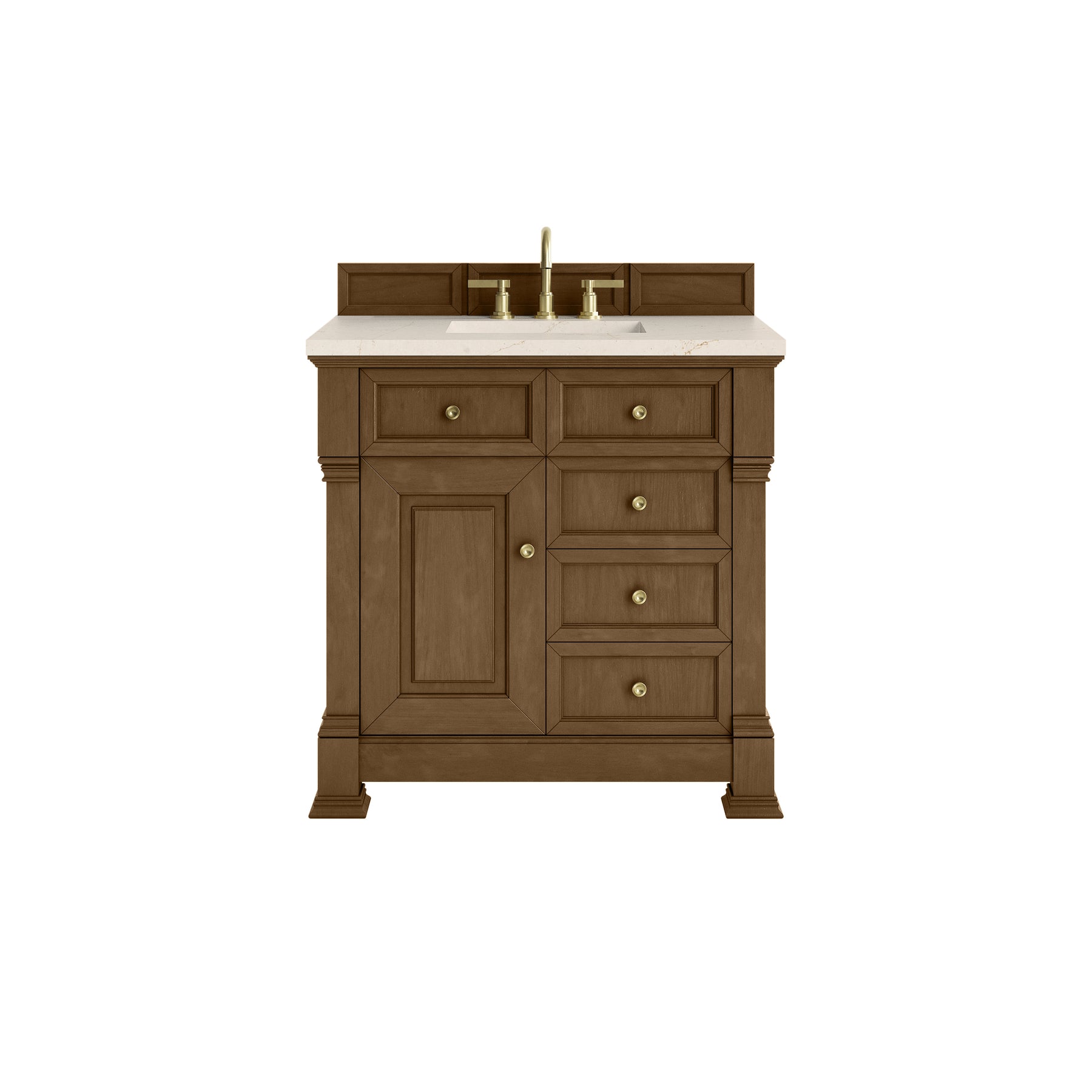 The Brookfield 36" Single Vanity in Honey Oak by James Martin Vanities offers a blend of traditional elegance and contemporary sophistication. The raised panel picture frame doors and detailed corner molding reflect timeless craftsmanship, while the warm Honey Oak finish and Champagne Brass hardware lend a fresh, modern appeal. This beautifully crafted vanity features a single-door cabinet with an interior shelf, a double-height drawer for added versatility, and two standard drawers for ample storage. The warm wood tones highlight the natural Oak wood grains, lending sophistication and charm to your space. The addition of an Eternal Marfil SilestoneĀ® top with undermount sink completes the look.