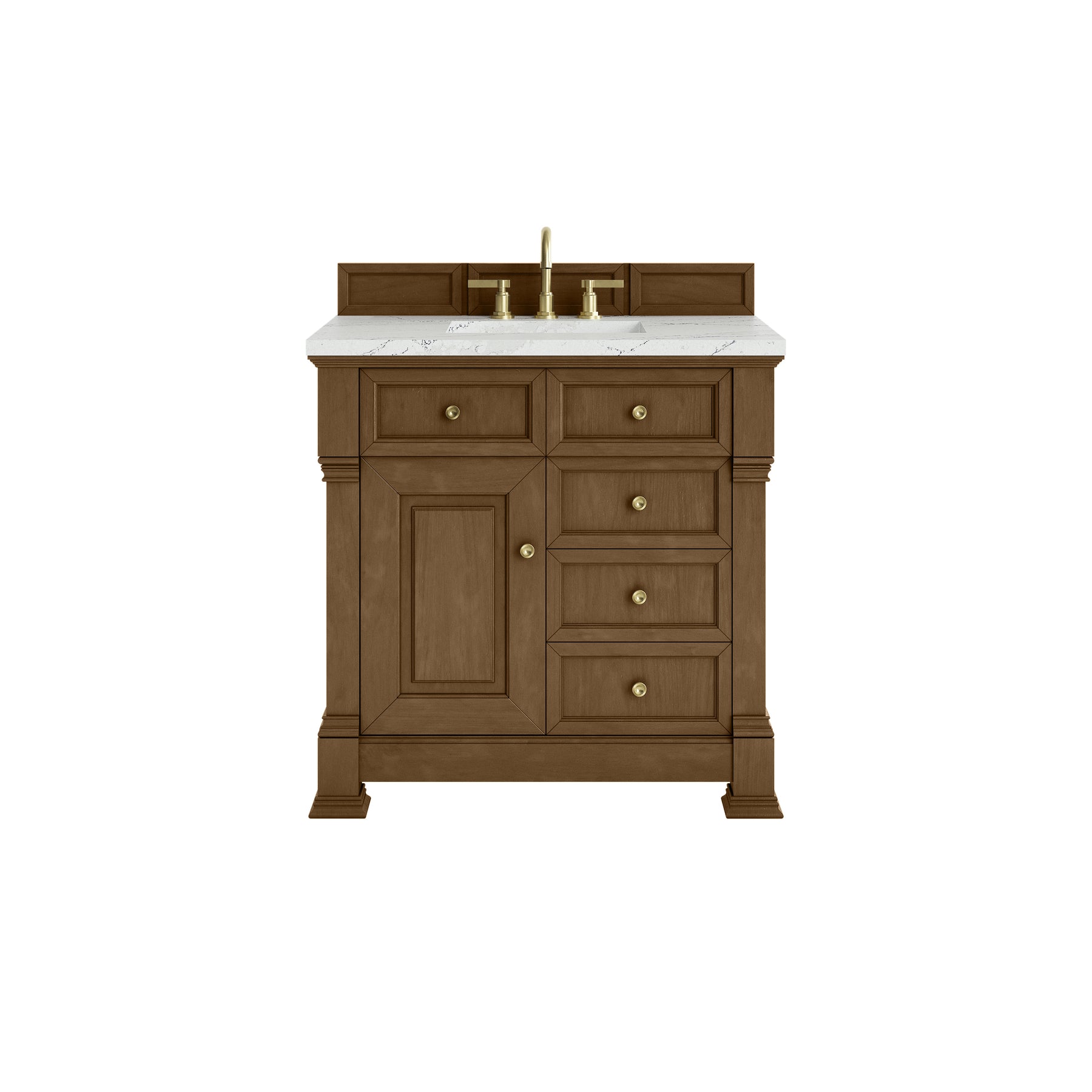 The Brookfield 36" Single Vanity in Honey Oak by James Martin Vanities offers a blend of traditional elegance and contemporary sophistication. The raised panel picture frame doors and detailed corner molding reflect timeless craftsmanship, while the warm Honey Oak finish and Champagne Brass hardware lend a fresh, modern appeal. This beautifully crafted vanity features a single-door cabinet with an interior shelf, a double-height drawer for added versatility, and two standard drawers for ample storage. The warm wood tones highlight the natural Oak wood grains, lending sophistication and charm to your space. The addition of an Ethereal Noctis SilestoneĀ® top with undermount sink completes the look.