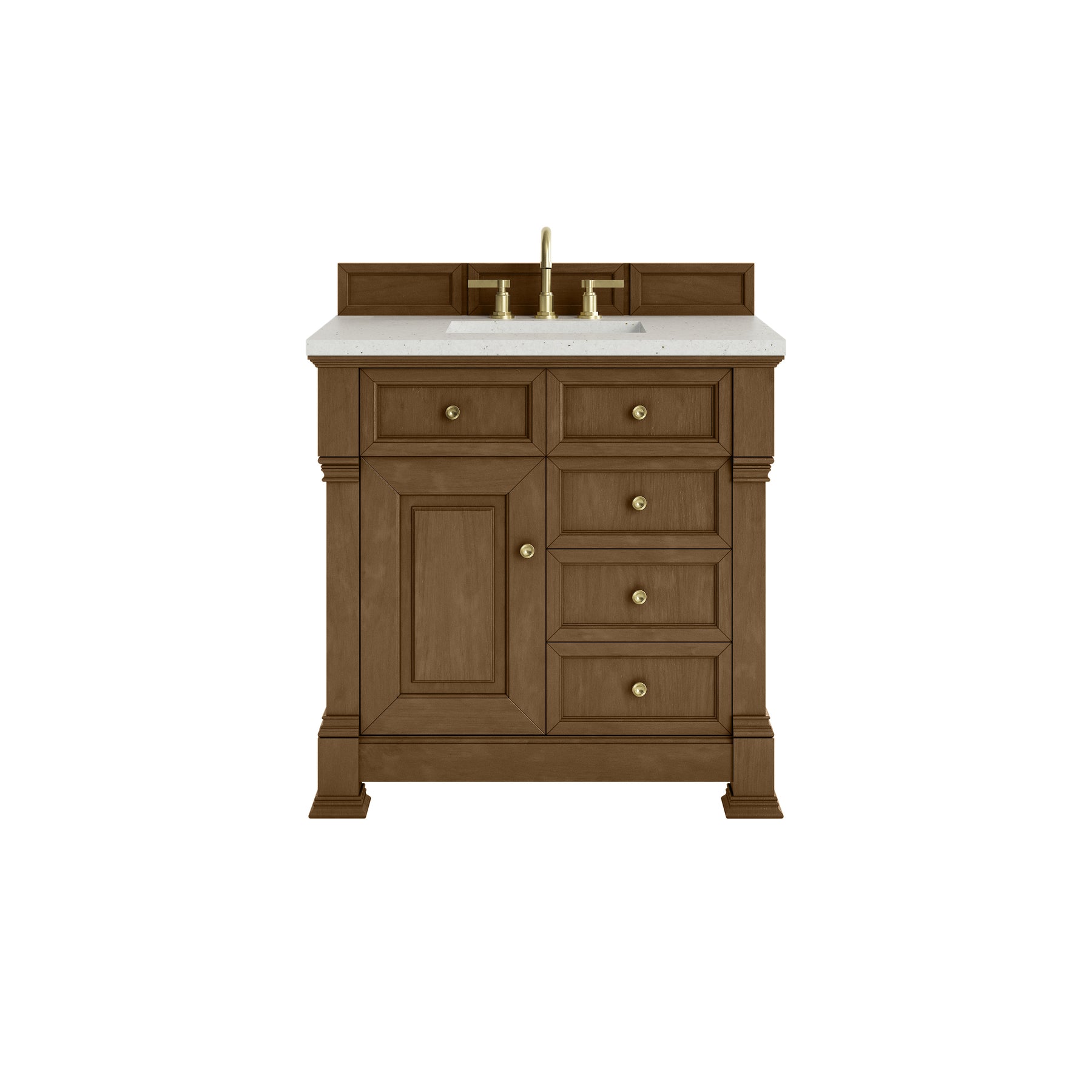 The Brookfield 36" Single Vanity in Honey Oak by James Martin Vanities offers a blend of traditional elegance and contemporary sophistication. The raised panel picture frame doors and detailed corner molding reflect timeless craftsmanship, while the warm Honey Oak finish and Champagne Brass hardware lend a fresh, modern appeal. This beautifully crafted vanity features a single-door cabinet with an interior shelf, a double-height drawer for added versatility, and two standard drawers for ample storage. The warm wood tones highlight the natural Oak wood grains, lending sophistication and charm to your space. The addition of a suede-finished Lime Delight SilestoneĀ® top with undermount sink completes the look.