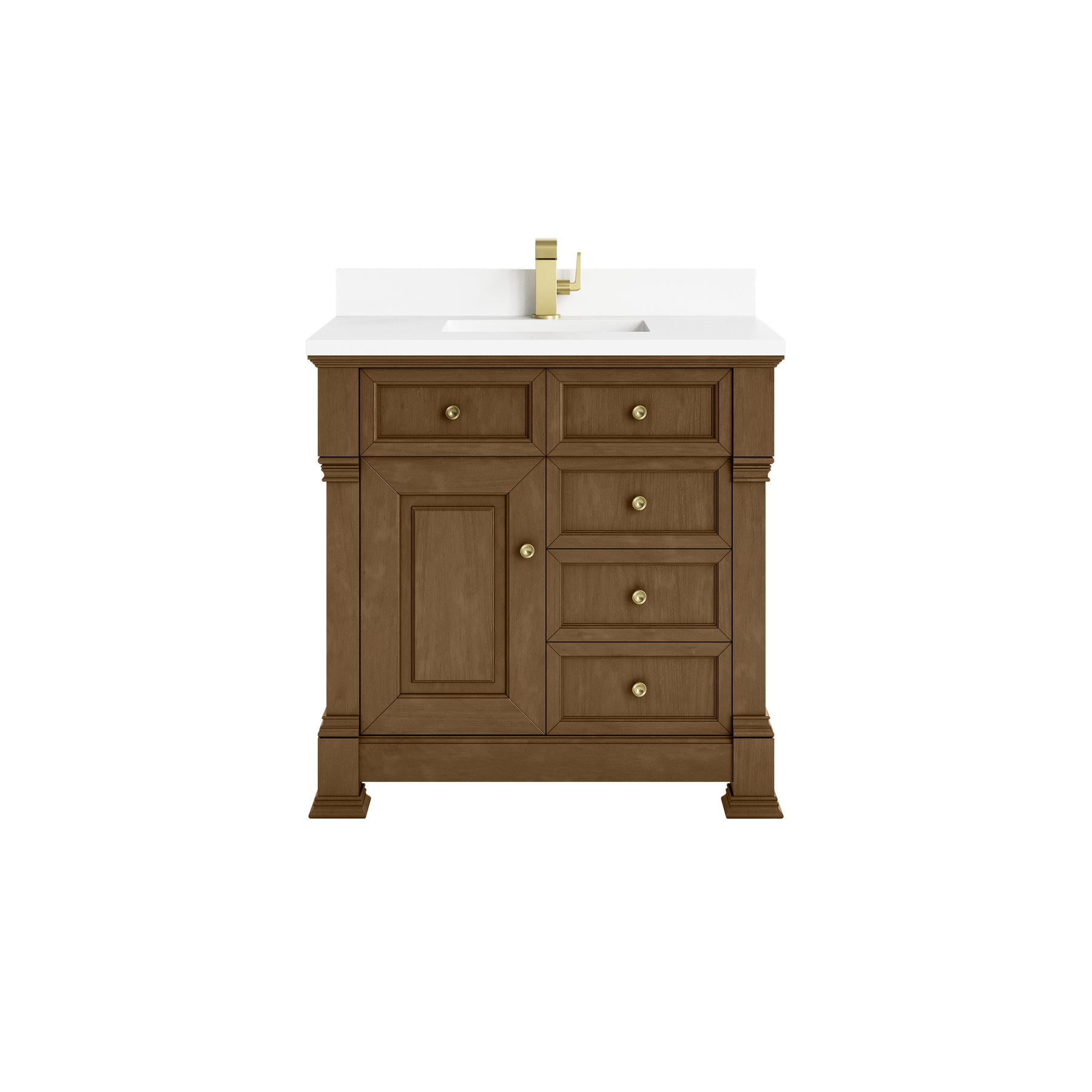 The Brookfield 36" Single Vanity in Honey Oak by James Martin Vanities offers a blend of traditional elegance and contemporary sophistication. The raised panel picture frame doors and detailed corner molding reflect timeless craftsmanship, while the warm Honey Oak finish and Champagne Brass hardware lend a fresh, modern appeal. This beautifully crafted vanity features a single-door cabinet with an interior shelf, a double-height drawer for added versatility, and two standard drawers for ample storage. The warm wood tones highlight the natural Oak wood grains, lending sophistication and charm to your space. The vanity is completed by a classic White Zeus SilestoneĀ® top and backsplash with undermount sink.
