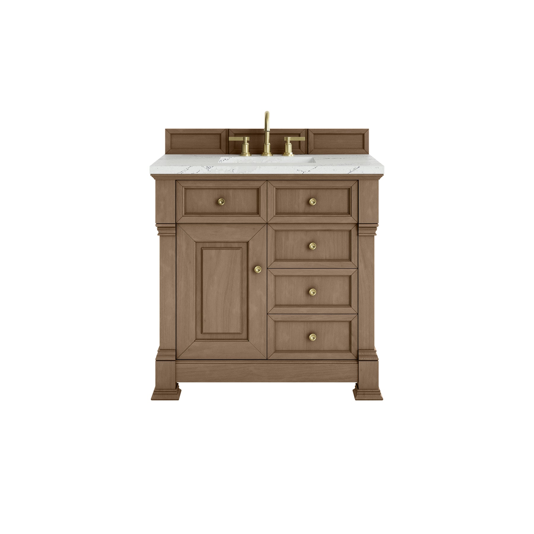 The Brookfield 36" Single Vanity in Pecan by James Martin Vanities offers a blend of traditional elegance and contemporary sophistication. The raised panel picture frame doors and detailed corner molding reflect timeless craftsmanship, while the Pecan finish and Champagne Brass hardware lend a fresh, modern appeal. This beautifully crafted vanity features a single-door cabinet with an interior shelf, a double-height drawer for added versatility, and two standard drawers for ample storage. The cool wood tones highlight the natural Oak wood grains, lending sophistication and charm to your space. The addition of an Ethereal Noctis Silestone® top with undermount sink completes the look.