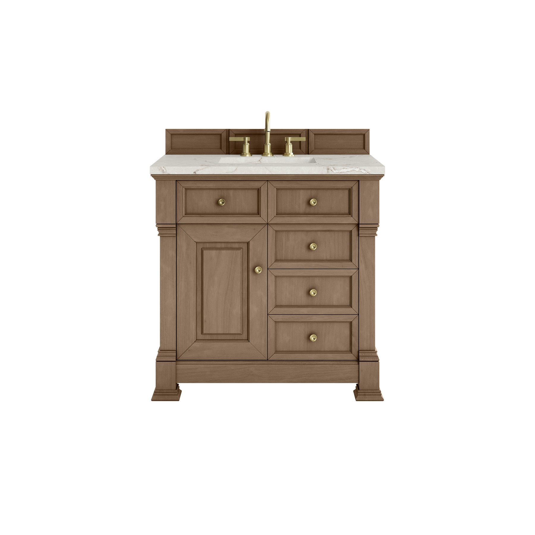The Brookfield 36" Single Vanity in Pecan by James Martin Vanities offers a blend of traditional elegance and contemporary sophistication. The raised panel picture frame doors and detailed corner molding reflect timeless craftsmanship, while the Pecan finish and Champagne Brass hardware lend a fresh, modern appeal. This beautifully crafted vanity features a single-door cabinet with an interior shelf, a double-height drawer for added versatility, and two standard drawers for ample storage. The cool wood tones highlight the natural Oak wood grains, lending sophistication and charm to your space. The addition of a Victorian Silver SilestoneĀ® top featuring a neutral white and gray background with fine silver veining, along with an undermount sink, completes the look.