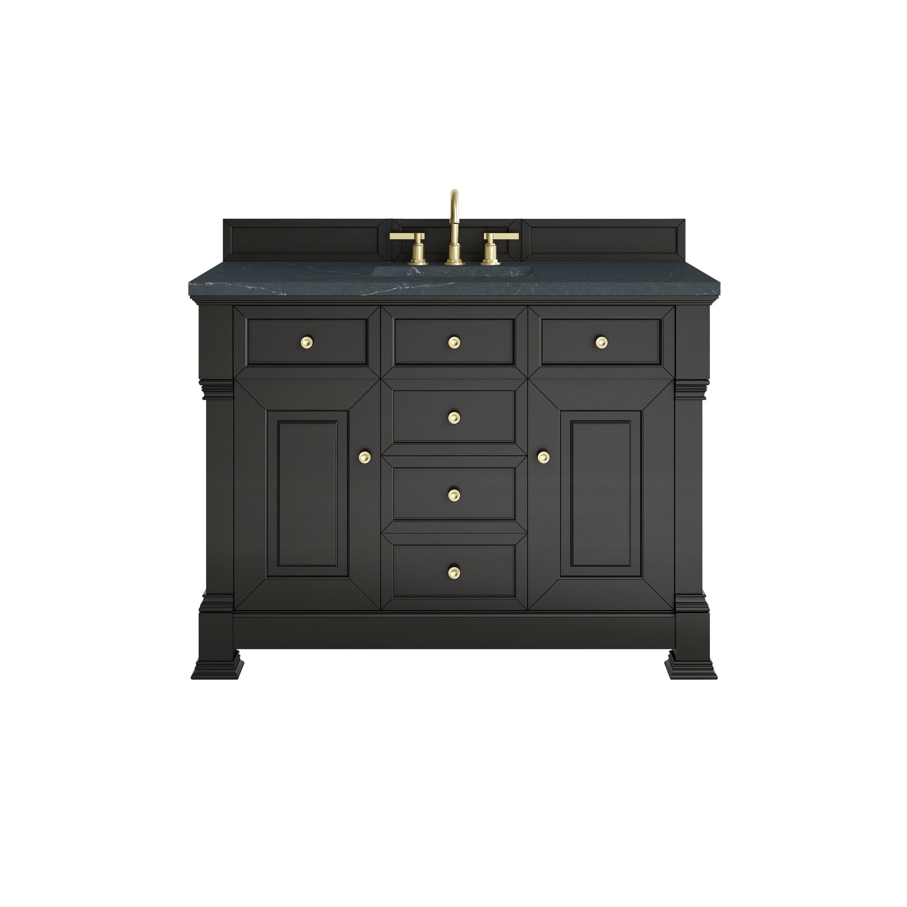 The Brookfield 48" Single Vanity in Black Onyx by James Martin Vanities offers a blend of traditional elegance and contemporary sophistication. The raised panel picture frame doors and detailed corner molding reflect timeless craftsmanship, while the rich Black Onyx vanity finish and Champagne Brass hardware lend a fresh, modern appeal. This beautifully crafted piece features two single-door cabinets that open to interior shelves, three standard drawers and one double height drawer for ample storage. The timeless Black Onyx finish lends sophistication and charm to your space. The addition of a matte Charcoal Soapstone SilestoneĀ® top with undermount sink completes the look.